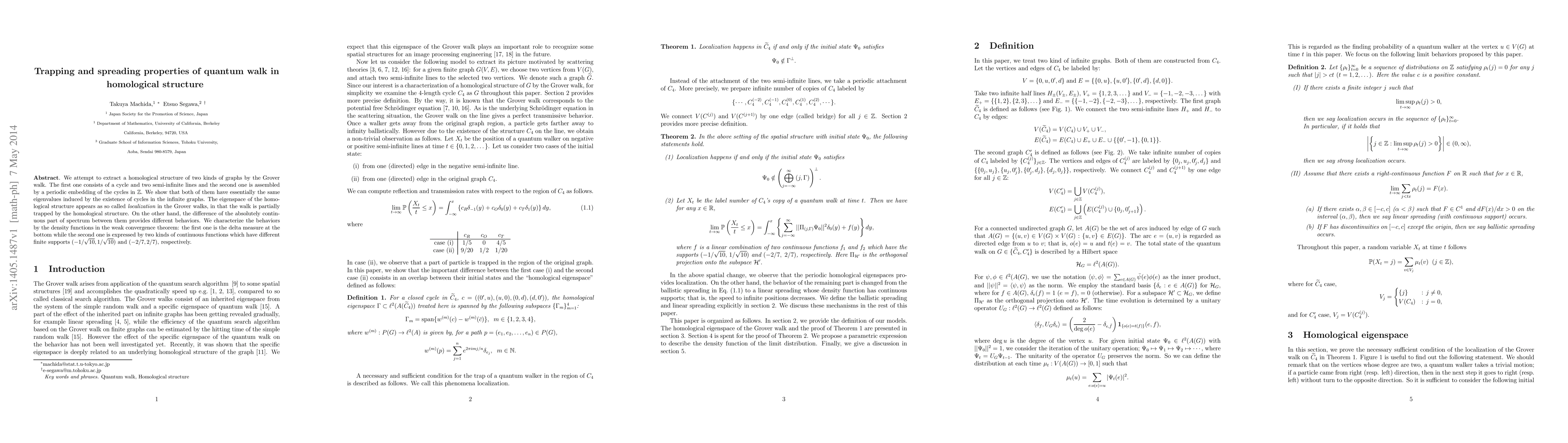 We attempt to extract a homological structure of two kinds of graphs by the Grover walk. The first one consists of a cycle and two semi-infinite lines and the second one is assembled by a periodic embedding of the cycles in $\mathbb{Z}$. We show that both of them have essentially the same eigenvalues induced by the existence of cycles in the infinite graphs. The eigenspace of the homological structure appears as so called {\it localization} in the Grover walks, in that the walk is partially trapped by the homological structure. On the other hand, the difference of the absolutely continuous part of spectrum between them provides different behaviors. We characterize the behaviors by the density functions in the weak convergence theorem: the first one is the delta measure at the bottom while the second one is expressed by two kinds of continuous functions which have different finite supports $(-1/\sqrt{10},1/\sqrt{10})$ and $(-2/7,2/7)$, respectively.