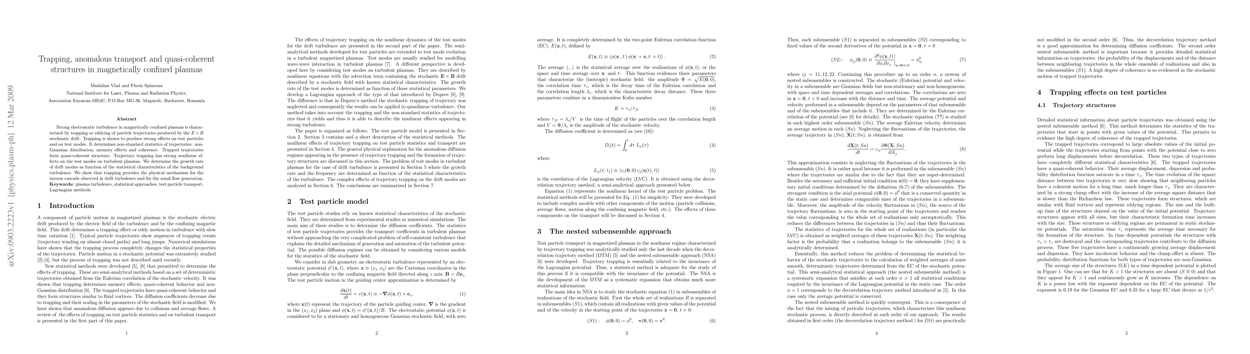 This paper explores the trapping and anomalous transport phenomena in magnetically confined plasmas, revealing how electrostatic turbulence leads to particle trajectory eddying via $E\times B$ drift. It demonstrates that trapping influences non-Gaussian distributions, memory effects, and quasi-coherent structures, ultimately affecting the growth rate of drift modes and contributing to inverse cascades and zonal flow generation.