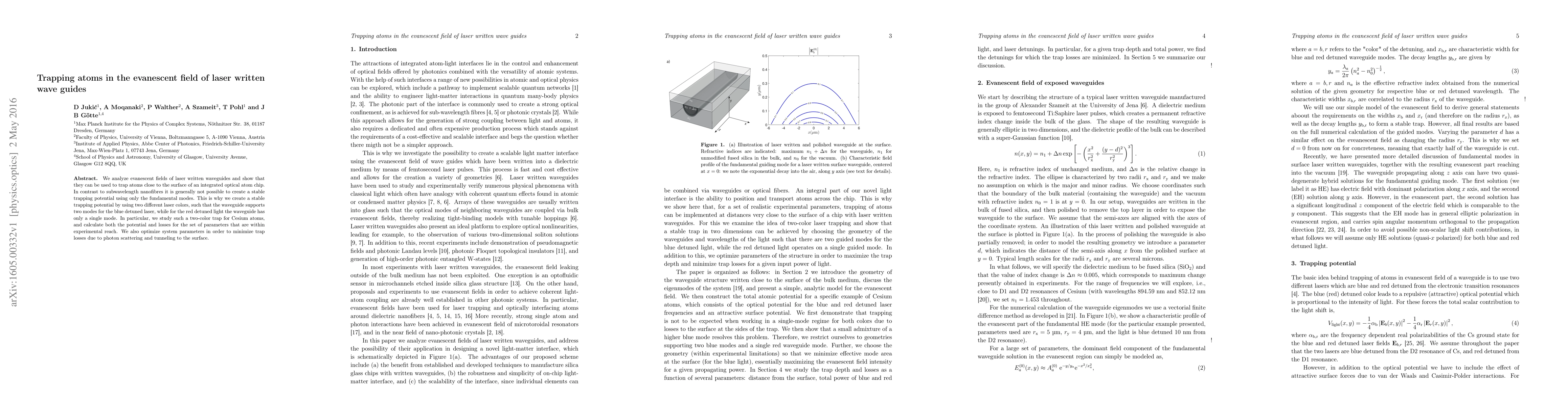 We analyze evanescent fields of laser written waveguides and show that they can be used to trap atoms close to the surface of an integrated optical atom chip. In contrast to subwavelength nanofibres it is generally not possible to create a stable trapping potential using only the fundamental modes. This is why we create a stable trapping potential by using two different laser colors, such that the waveguide supports two modes for the blue detuned laser, while for the red detuned light the waveguide has only a single mode. In particular, we study such a two-color trap for Cesium atoms, and calculate both the potential and losses for the set of parameters that are within experimental reach. We also optimize system parameters in order to minimize trap losses due to photon scattering and tunneling to the surface.