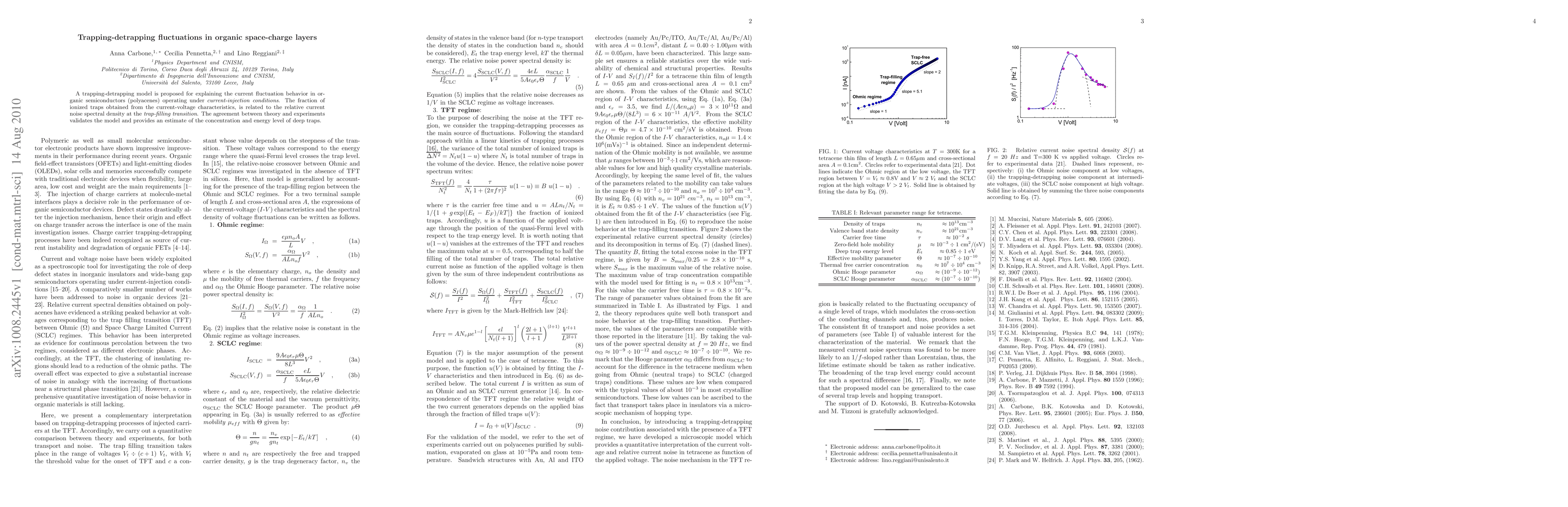This paper proposes a trapping-detrapping model to explain current fluctuation behavior in organic semiconductors, correlating ionized trap fractions with current noise spectral density. The model's validation through experimental data provides insights into deep trap concentration and energy levels.