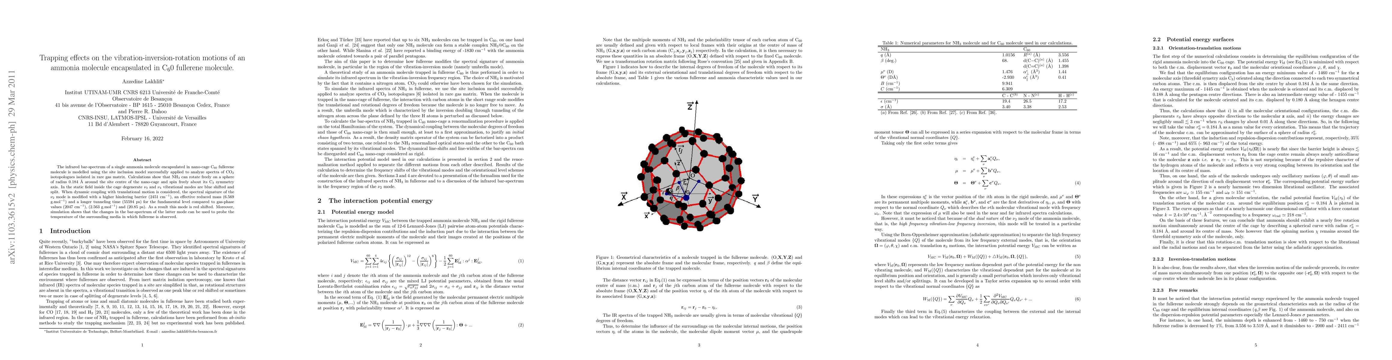 The infrared bar-spectrum of a single ammonia molecule encapsulated in nano-cage C$_{60}$ fullerene molecule is modelled using the site inclusion model successfully applied to analyze spectra of CO$_2$ isotopologues isolated in rare gas matrix. Calculations show that NH$_3$ can rotate freely on a sphere of radius 0.184 $\text{\AA}$ around the site centre of the nano-cage and spin freely about its C$_3$ symmetry axis. In the static field inside the cage degenerate $\nu_3$ and $\nu_4$ vibrational modes are blue shifted and split. When dynamic coupling with translational motion is considered, the spectral signature of the $\nu_2$ mode is modified with a higher hindering barrier (2451 cm$^{-1}$), an effective reduced mass (6.569 g.mol$^{-1}$) and a longer tunneling time (55594 ps) for the fundamental level compared to gas-phase values (2047 cm$^{-1}$), (2.563 g.mol$^{-1}$) and (20.85 ps). As a result this mode is red shifted. Moreover, simulation shows that the changes in the bar-spectrum of the latter mode can be used to probe the temperature of the surrounding media in which fullerene is observed.