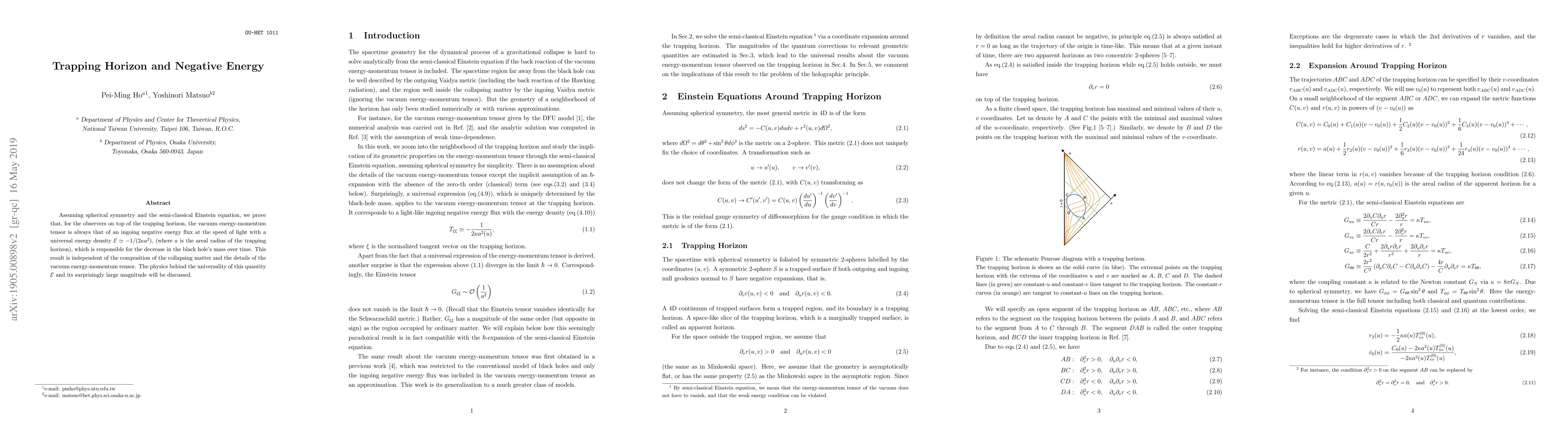 Assuming spherical symmetry and the semi-classical Einstein equation, we prove that, for the observers on top of the trapping horizon, the vacuum energy-momentum tensor is always that of an ingoing negative energy flux at the speed of light with a universal energy density ${\cal E} \simeq - 1/(2\kappa a^2)$, (where $a$ is the areal radius of the trapping horizon), which is responsible for the decrease in the black hole's mass over time. This result is independent of the composition of the collapsing matter and the details of the vacuum energy-momentum tensor. The physics behind the universality of this quantity ${\cal E}$ and its surprisingly large magnitude will be discussed.