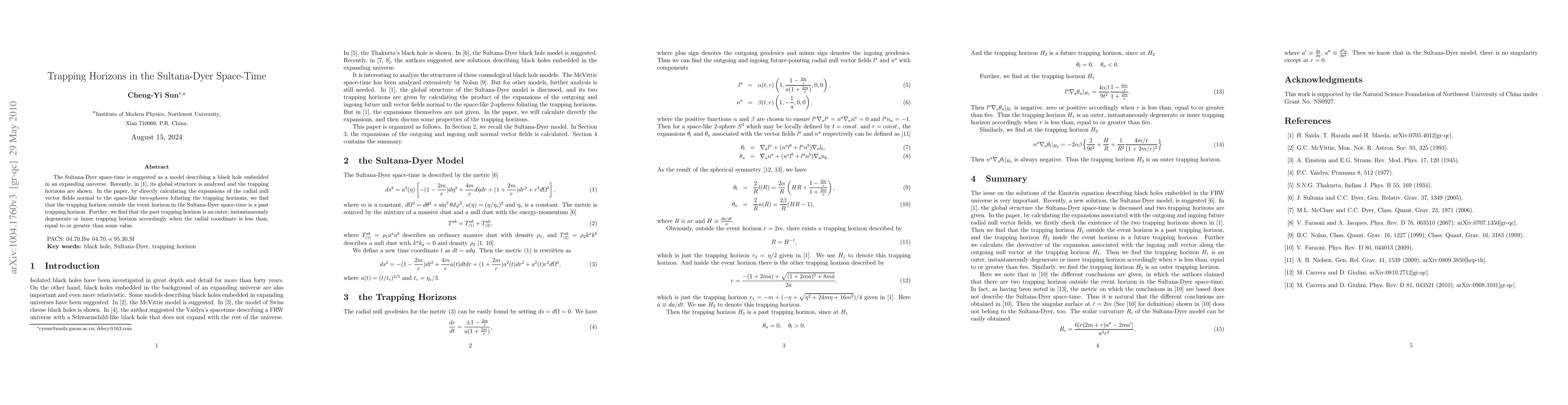 The Sultana-Dyer space-time is suggested as a model describing a black hole embedded in an expanding universe. Recently, in \cite{0705.4012}, its global structure is analyzed and the trapping horizons are shown. In the paper, by directly calculating the expansions of the radial null vector fields normal to the space-like two-spheres foliating the trapping horizons, we find that the trapping horizon outside the event horizon in the Sultana-Dyer space-time is a past trapping horizon. Further, we find that the past trapping horizon is an outer, instantaneously degenerate or inner trapping horizon accordingly when the radial coordinate is less than, equal to or greater than some value.