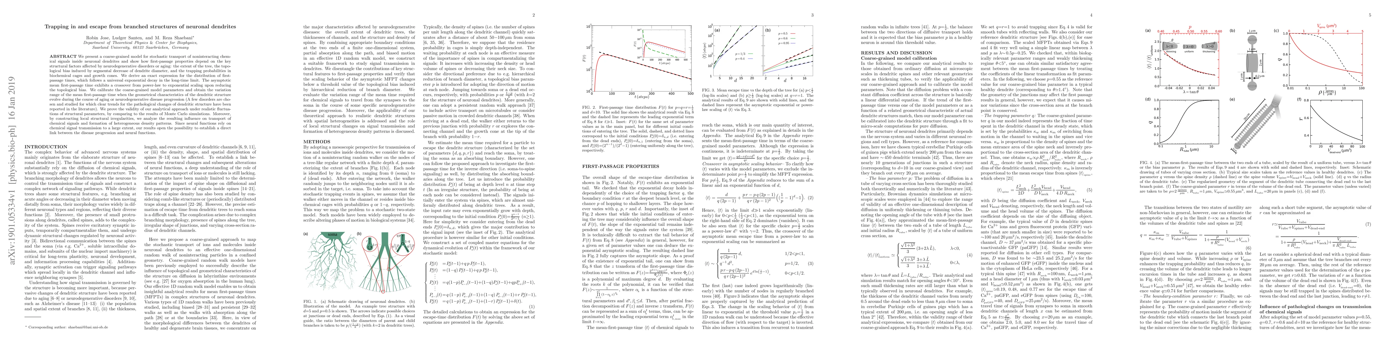 We present a coarse-grained model for stochastic transport of noninteracting chemical signals inside neuronal dendrites and show how first-passage properties depend on the key structural factors affected by neurodegenerative disorders or aging: the extent of the tree, the topological bias induced by segmental decrease of dendrite diameter, and the trapping probabilities in biochemical cages and growth cones. We derive an exact expression for the distribution of first-passage times, which follows a universal exponential decay in the long-time limit. The asymptotic mean first-passage time exhibits a crossover from power-law to exponential scaling upon reducing the topological bias. We calibrate the coarse-grained model parameters and obtain the variation range of the mean first-passage time when the geometrical characteristics of the dendritic structure evolve during the course of aging or neurodegenerative disease progression (A few disorders are chosen and studied for which clear trends for the pathological changes of dendritic structure have been reported in the literature). We prove the validity of our analytical approach under realistic fluctuations of structural parameters, by comparing to the results of Monte Carlo simulations. Moreover, by constructing local structural irregularities, we analyze the resulting influence on transport of chemical signals and formation of heterogeneous density patterns. Since neural functions rely on chemical signal transmission to a large extent, our results open the possibility to establish a direct link between the disease progression and neural functions.