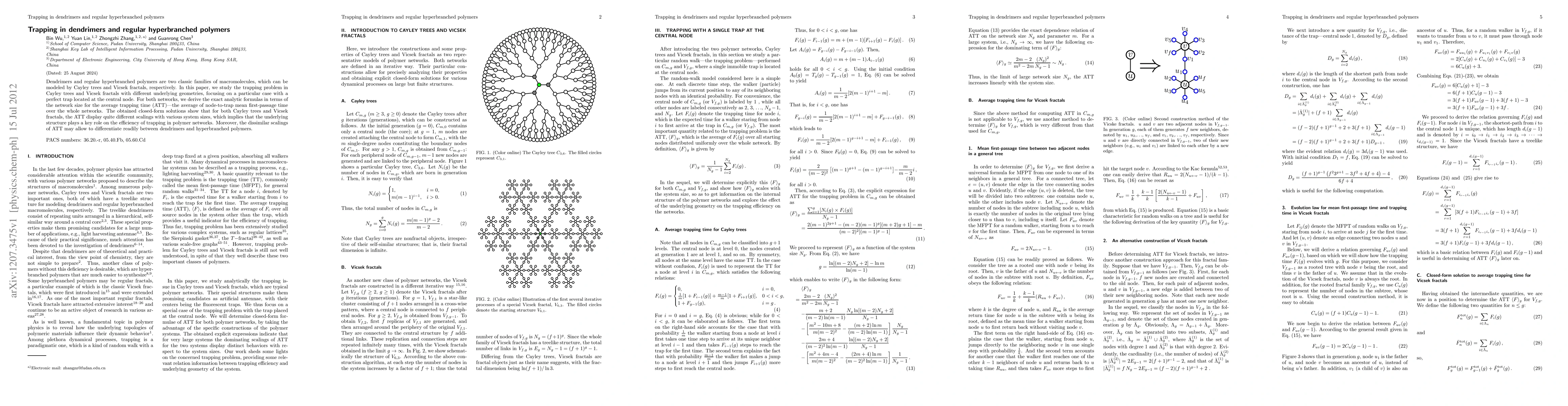 This paper investigates trapping dynamics in dendrimers (Cayley trees) and regular hyperbranched polymers (Vicsek fractals) with a perfect trap at the central node. It derives exact analytic formulas for the average trapping time, revealing distinct scaling behaviors that highlight the influence of network structure on trapping efficiency and enable differentiation between dendrimers and hyperbranched polymers.