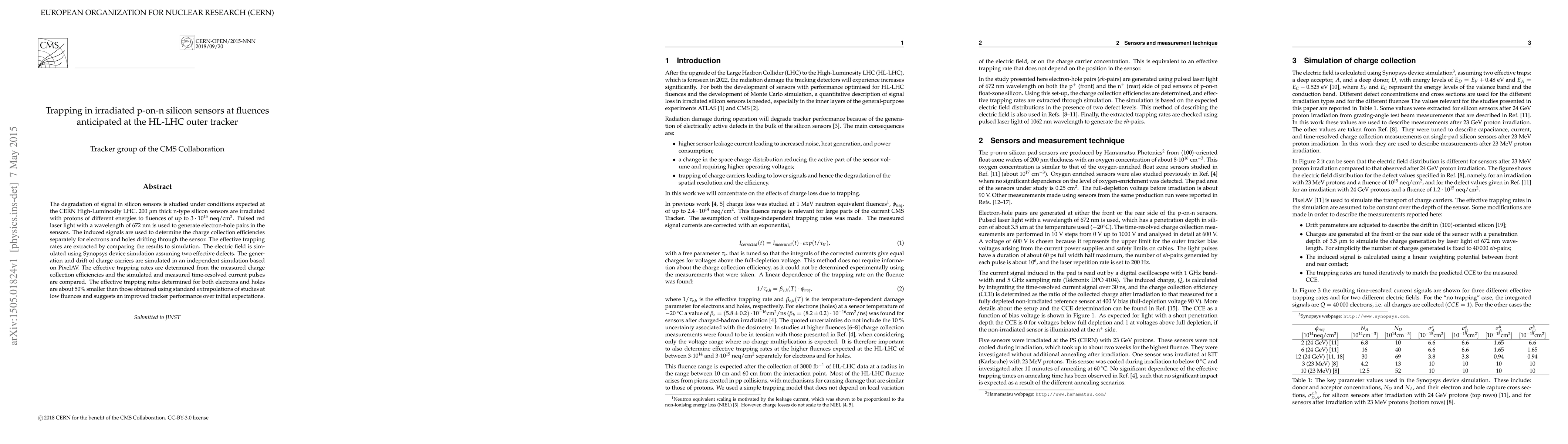 The degradation of signal in silicon sensors is studied under conditions expected at the CERN High-Luminosity LHC. 200 $\mu$m thick n-type silicon sensors are irradiated with protons of different energies to fluences of up to $3 \cdot 10^{15}$ neq/cm$^2$. Pulsed red laser light with a wavelength of 672 nm is used to generate electron-hole pairs in the sensors. The induced signals are used to determine the charge collection efficiencies separately for electrons and holes drifting through the sensor. The effective trapping rates are extracted by comparing the results to simulation. The electric field is simulated using Synopsys device simulation assuming two effective defects. The generation and drift of charge carriers are simulated in an independent simulation based on PixelAV. The effective trapping rates are determined from the measured charge collection efficiencies and the simulated and measured time-resolved current pulses are compared. The effective trapping rates determined for both electrons and holes are about 50% smaller than those obtained using standard extrapolations of studies at low fluences and suggests an improved tracker performance over initial expectations.