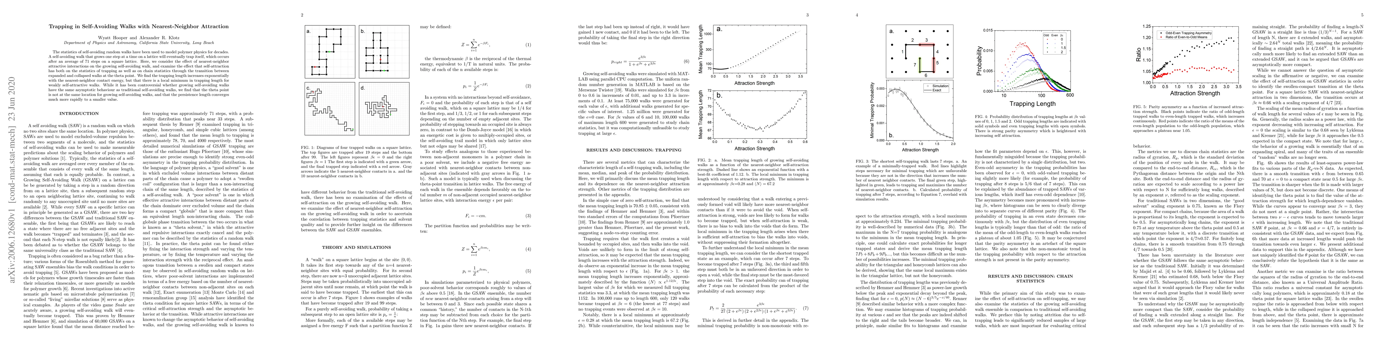 This paper investigates how nearest-neighbor attraction affects the trapping behavior of self-avoiding random walks, finding that trapping length increases exponentially with attraction but exhibits a local minimum for weak attraction. It concludes that growing self-avoiding walks do not follow the same asymptotic behavior as traditional ones, with a different theta point and a more rapid convergence of persistence length.