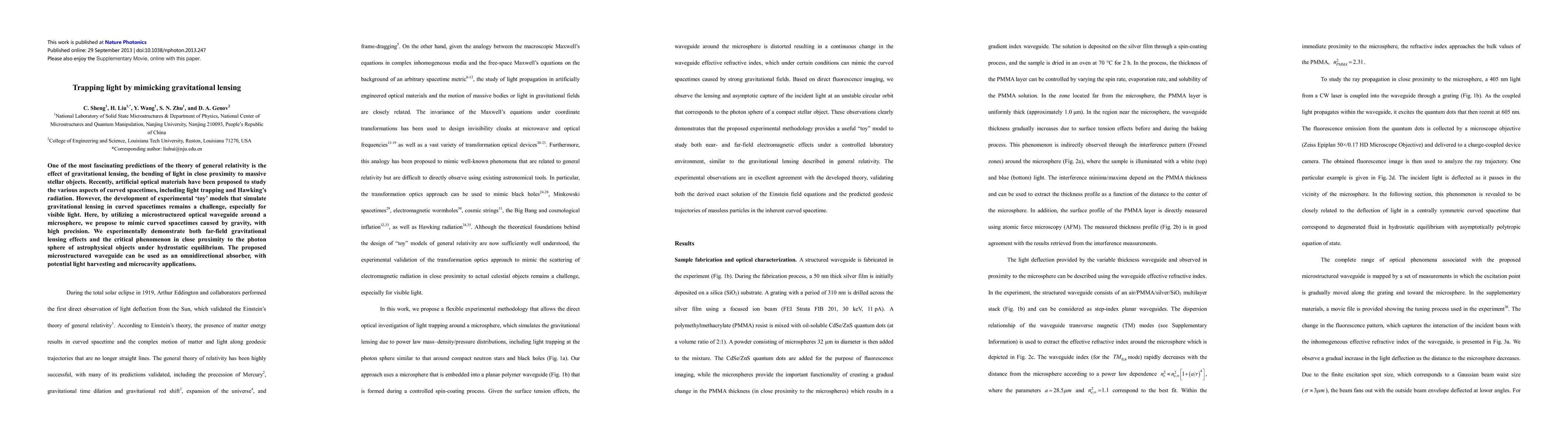 One of the most fascinating predictions of the theory of general relativity is the effect of gravitational lensing, the bending of light in close proximity to massive stellar objects. Recently, artificial optical materials have been proposed to study the various aspects of curved spacetimes, including light trapping and Hawking's radiation. However, the development of experimental toy models that simulate gravitational lensing in curved spacetimes remains a challenge, especially for visible light. Here, by utilizing a microstructured optical waveguide around a microsphere, we propose to mimic curved spacetimes caused by gravity, with high precision. We experimentally demonstrate both far-field gravitational lensing effects and the critical phenomenon in close proximity to the photon sphere of astrophysical objects under hydrostatic equilibrium. The proposed microstructured waveguide can be used as an omnidirectional absorber, with potential light harvesting and microcavity applications.