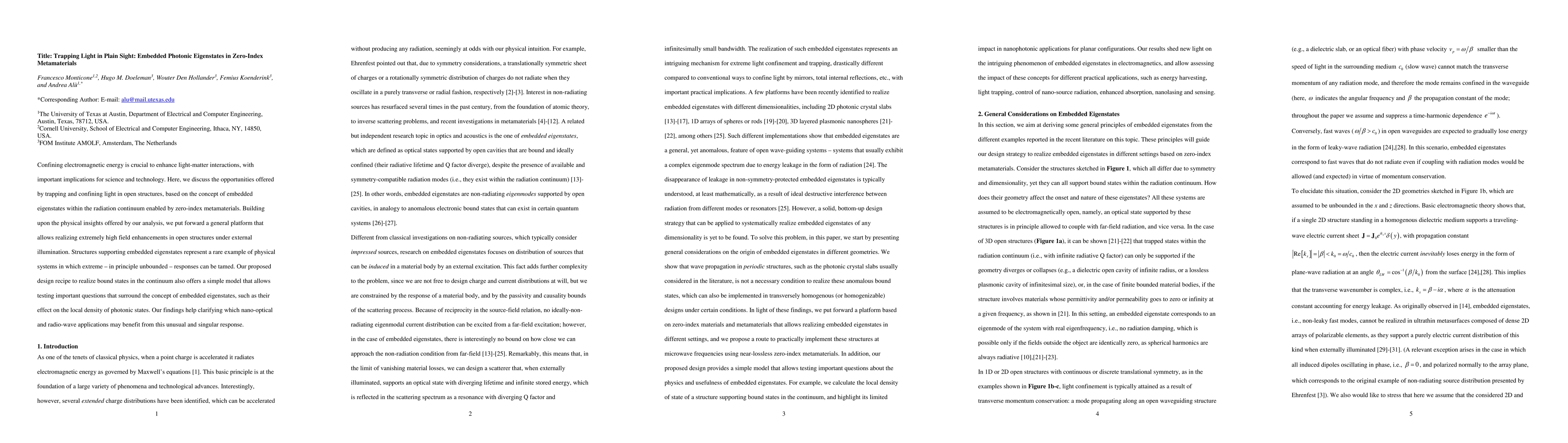 This paper explores the concept of trapping light in open structures using zero-index metamaterials to create embedded photonic eigenstates, offering a method for achieving high field enhancements. The proposed design provides insights into the local density of photonic states and potential applications in nano-optical and radio-wave technologies.