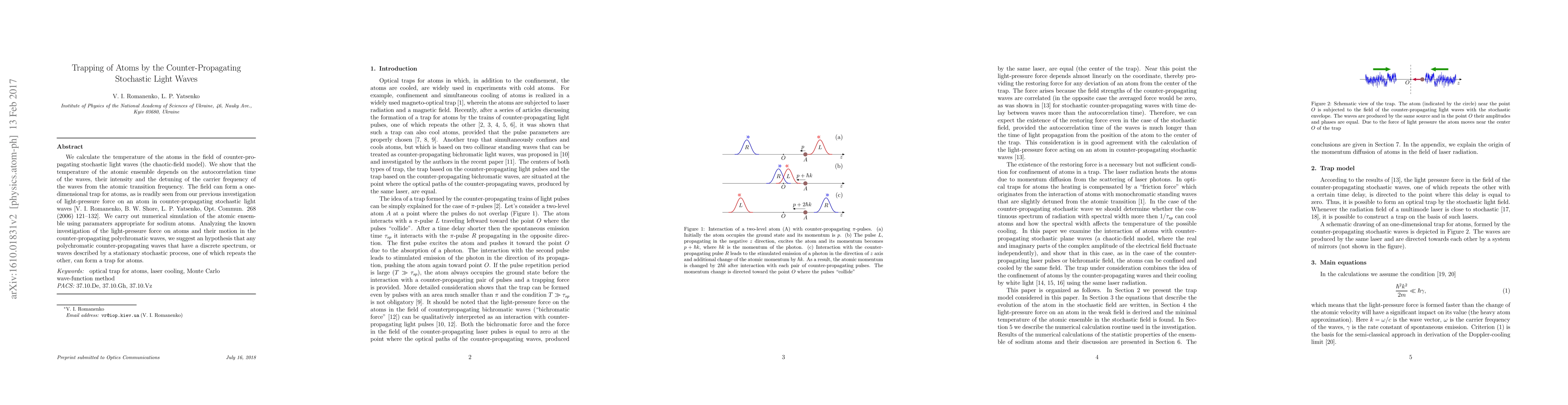 This paper investigates the trapping of atoms by counter-propagating stochastic light waves, finding that the temperature and trapping effectiveness depend on wave autocorrelation time, intensity, and frequency detuning. The study hypothesizes that any polychromatic counter-propagating waves with a discrete spectrum or a repeating stochastic process can form an atomic trap.