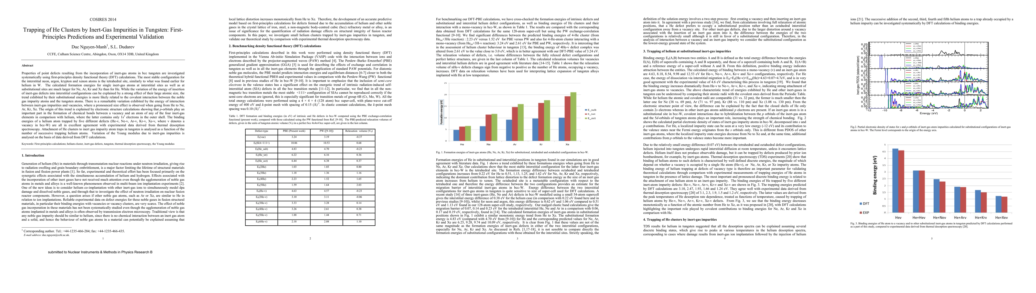 This paper investigates the trapping of helium clusters by inert-gas impurities in tungsten using first-principles density functional theory (DFT) calculations. The study finds that larger inert-gas atoms (Ne, Ar, Kr, Xe) form more stable configurations compared to helium, with a significant size effect influencing their interaction with vacancies. The results are validated by excellent agreement with experimental data from thermal desorption spectroscopy.