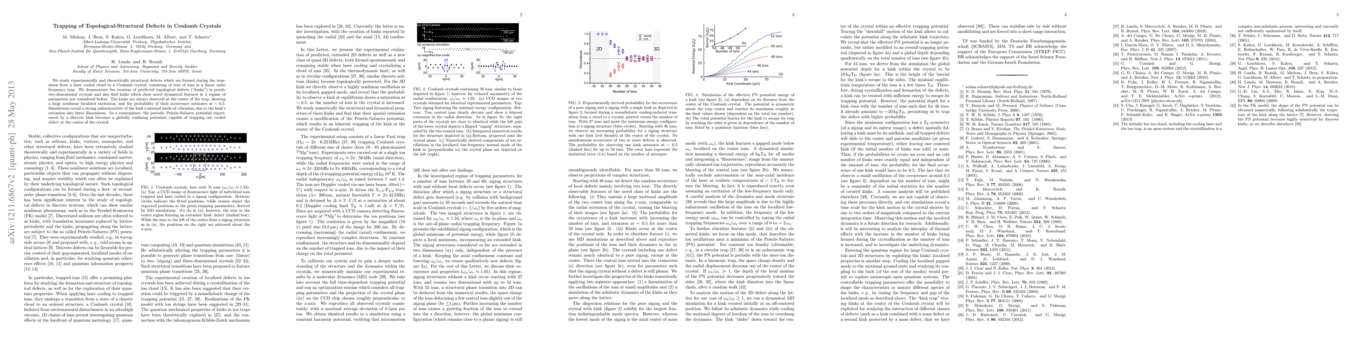 This paper investigates the formation and dynamics of topological defects in Coulomb crystals of ions, finding that predicted "kinks" appear centrally and exhibit unique nonlinear behavior. The study reveals that these defects can be trapped at the center due to their three-dimensional extension, leading to a globally confining potential.