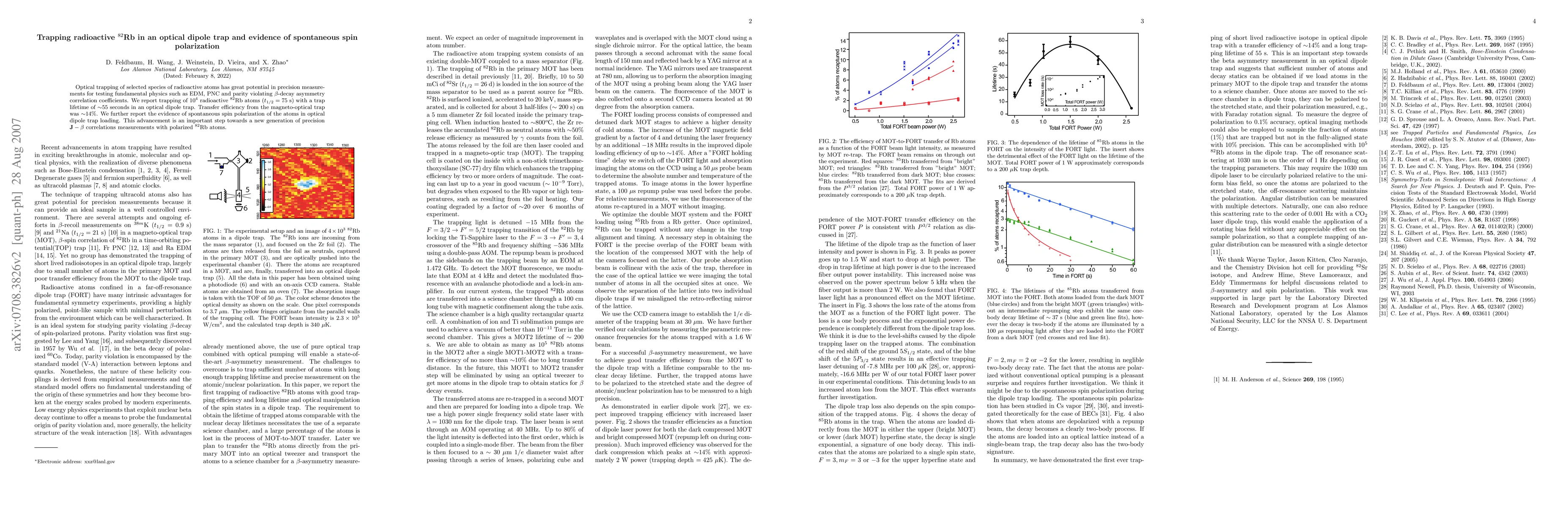 This paper reports the successful trapping of 10^4 radioactive ^{82}Rb atoms in an optical dipole trap with a transfer efficiency of 14%, and provides evidence of spontaneous spin polarization during the loading process, marking a significant step towards precision measurements in fundamental physics.