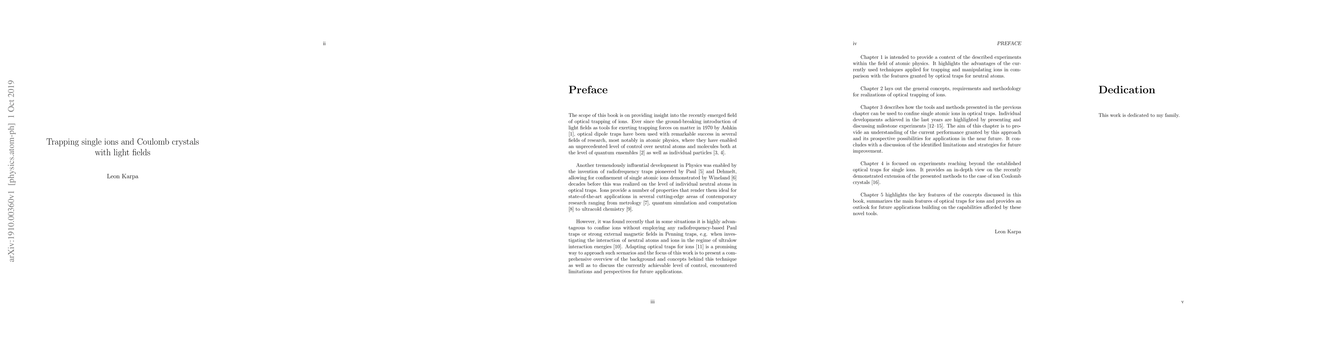 The scope of this book is on providing insight into the recently emerged field of optical trapping of ions. Since the ground-breaking introduction of light fields as tools for exerting trapping forces on matter in 1970 by Ashkin, optical dipole traps have enabled an unprecedented level of control over neutral atoms and molecules both at the level of quantum ensembles as well as individual particles. It was found recently that in some situations it is highly advantageous to confine atomic and molecular ions without employing any radiofrequency-based Paul traps or strong external magnetic fields as used in Penning traps, e.g. when investigating the interaction of neutral atoms and ions in the regime of ultralow interaction energies. Adapting optical traps for ions is a promising way to approach such scenarios and the focus of this work is to present a comprehensive overview of the background and concepts behind this technique as well as to discuss the currently achievable level of control, encountered limitations and perspectives for future applications.