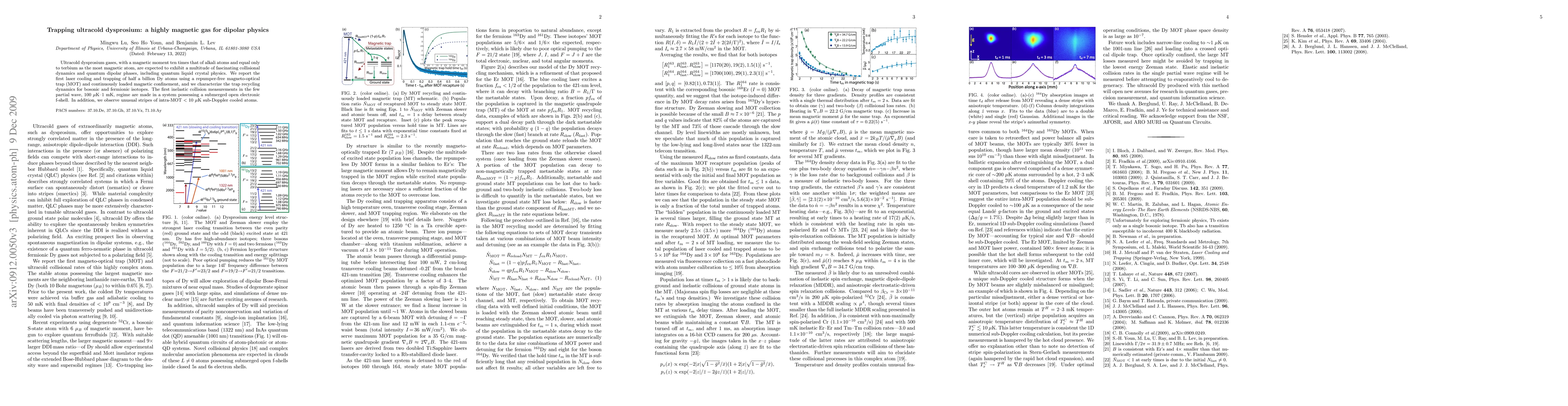 This paper reports the successful laser cooling and trapping of ultracold dysprosium atoms, which possess a magnetic moment ten times that of alkali atoms, enabling unique quantum dipolar physics studies. The researchers achieved trapping of half a billion Dy atoms and characterized the dynamics, including the first inelastic collision measurements in the low-temperature regime.