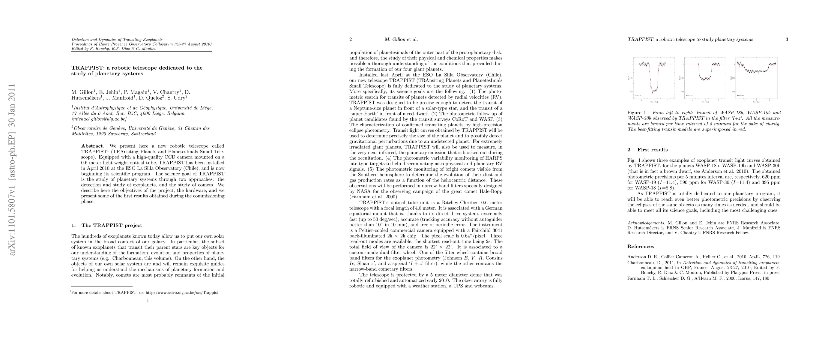 TRAPPIST is a robotic telescope designed for the study of planetary systems, including the detection and analysis of exoplanets and comets. Installed in 2010 at the ESO La Silla Observatory, it has begun its scientific program with promising initial results.
