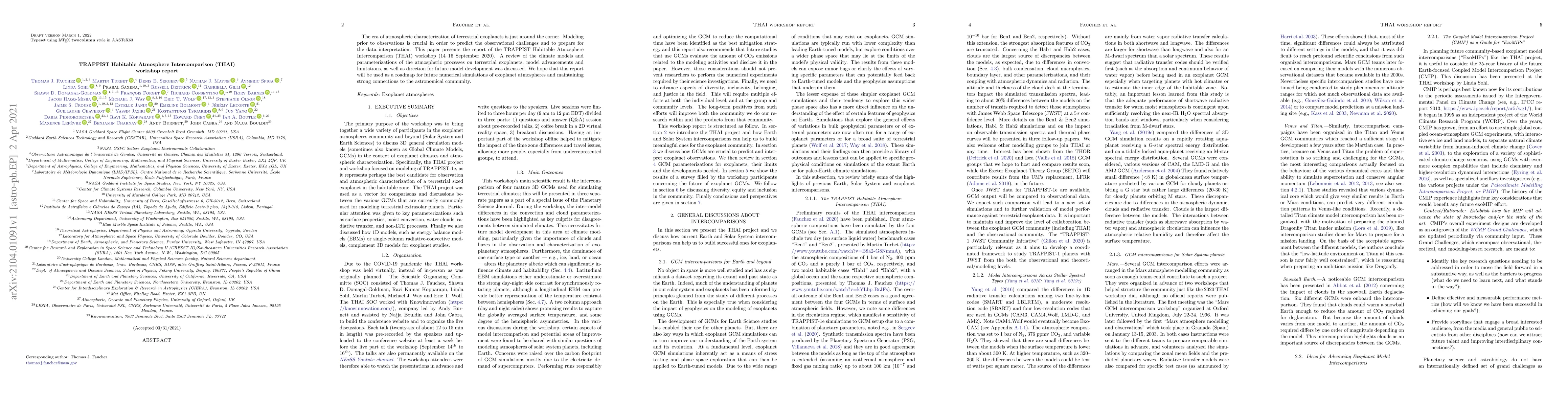 The era of atmospheric characterization of terrestrial exoplanets is just around the corner. Modeling prior to observations is crucial in order to predict the observational challenges and to prepare for the data interpretation. This paper presents the report of the TRAPPIST Habitable Atmosphere Intercomparison (THAI) workshop (14-16 September 2020). A review of the climate models and parameterizations of the atmospheric processes on terrestrial exoplanets, model advancements and limitations, as well as direction for future model development was discussed. We hope that this report will be used as a roadmap for future numerical simulations of exoplanet atmospheres and maintaining strong connections to the astronomical community.