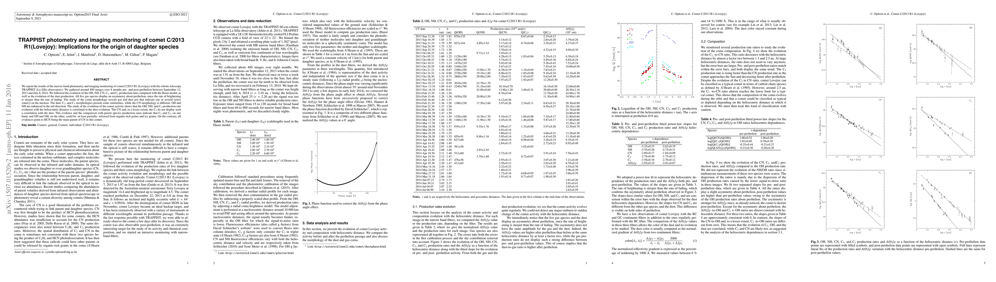 The TRAPPIST observatory monitored comet C/2013 R1 (Lovejoy) over 8 months, revealing asymmetrical evolution of OH, NH, CN, C3, and C2 production rates around perihelion. Gas and dust jets suggest active zones on the nucleus, with OH, NH, and C2 correlating with dust production, while CN and C3 don't. This implies C2 and OH/NH may stem from organic-rich grains, whereas HCN is the primary parent of CN.