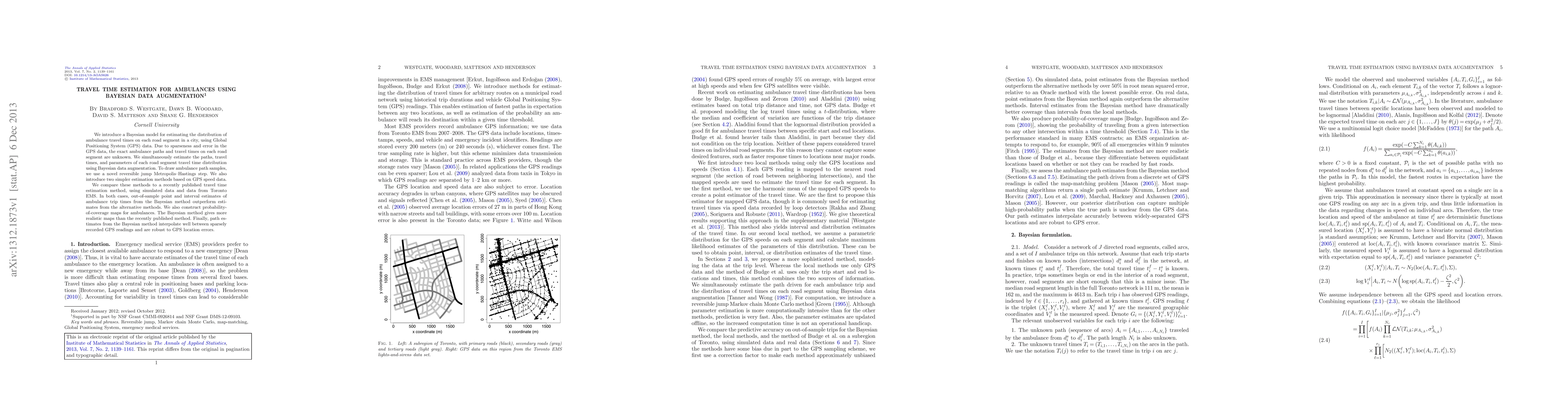 This paper proposes a Bayesian model for estimating ambulance travel times using GPS data, employing Bayesian data augmentation to infer paths and travel times. The method outperforms simpler alternatives and provides more realistic probability-of-coverage maps, demonstrating robustness to GPS data errors.