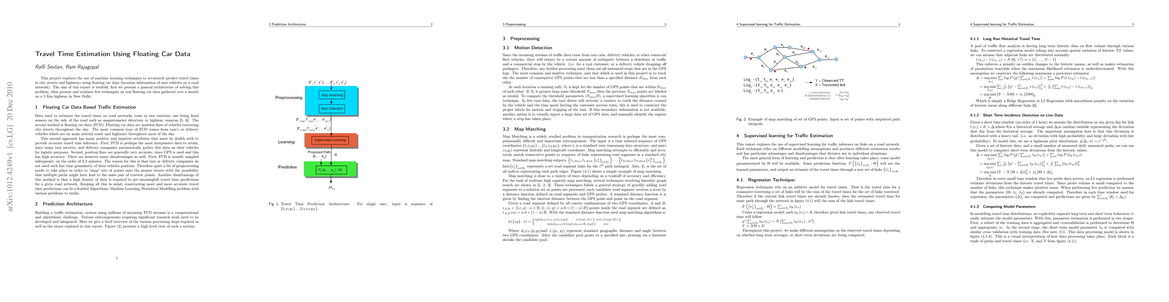 This report explores the use of machine learning techniques to accurately predict travel times in city streets and highways using floating car data (location information of user vehicles on a road network). The aim of this report is twofold, first we present a general architecture of solving this problem, then present and evaluate few techniques on real floating car data gathered over a month on a 5 Km highway in New Delhi.