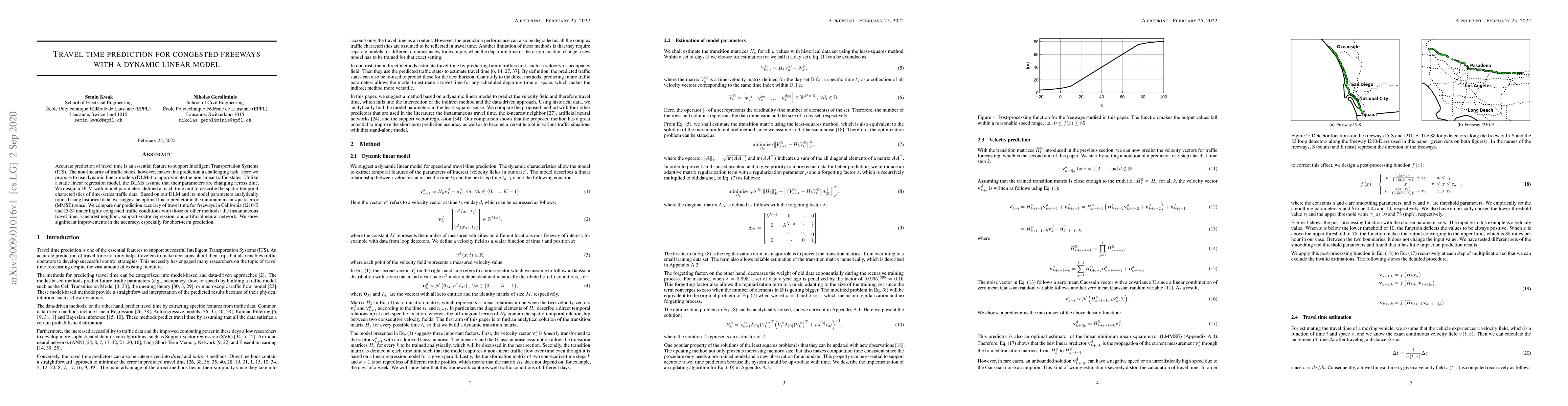 Accurate prediction of travel time is an essential feature to support Intelligent Transportation Systems (ITS). The non-linearity of traffic states, however, makes this prediction a challenging task. Here we propose to use dynamic linear models (DLMs) to approximate the non-linear traffic states. Unlike a static linear regression model, the DLMs assume that their parameters are changing across time. We design a DLM with model parameters defined at each time unit to describe the spatio-temporal characteristics of time-series traffic data. Based on our DLM and its model parameters analytically trained using historical data, we suggest an optimal linear predictor in the minimum mean square error (MMSE) sense. We compare our prediction accuracy of travel time for freeways in California (I210-E and I5-S) under highly congested traffic conditions with those of other methods: the instantaneous travel time, k-nearest neighbor, support vector regression, and artificial neural network. We show significant improvements in the accuracy, especially for short-term prediction.