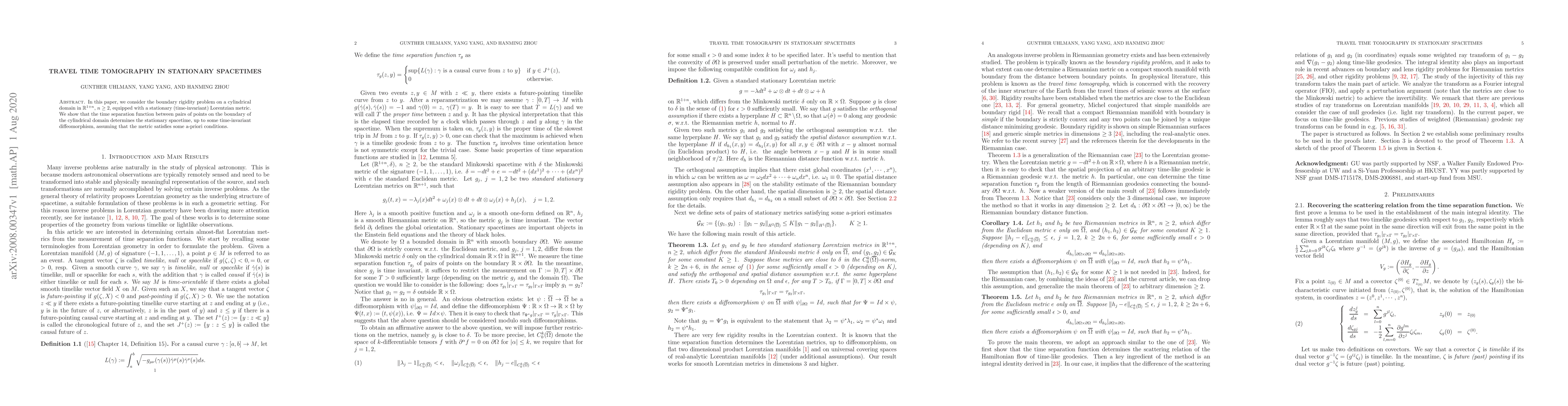 In this paper, we consider the boundary rigidity problem on a cylindrical domain in $\mathbb R^{1+n}$, $n\geq 2$, equipped with a stationary (time-invariant) Lorentzian metric. We show that the time separation function between pairs of points on the boundary of the cylindrical domain determines the stationary spacetime, up to some time-invariant diffeomorphism, assuming that the metric satisfies some a-priori conditions.