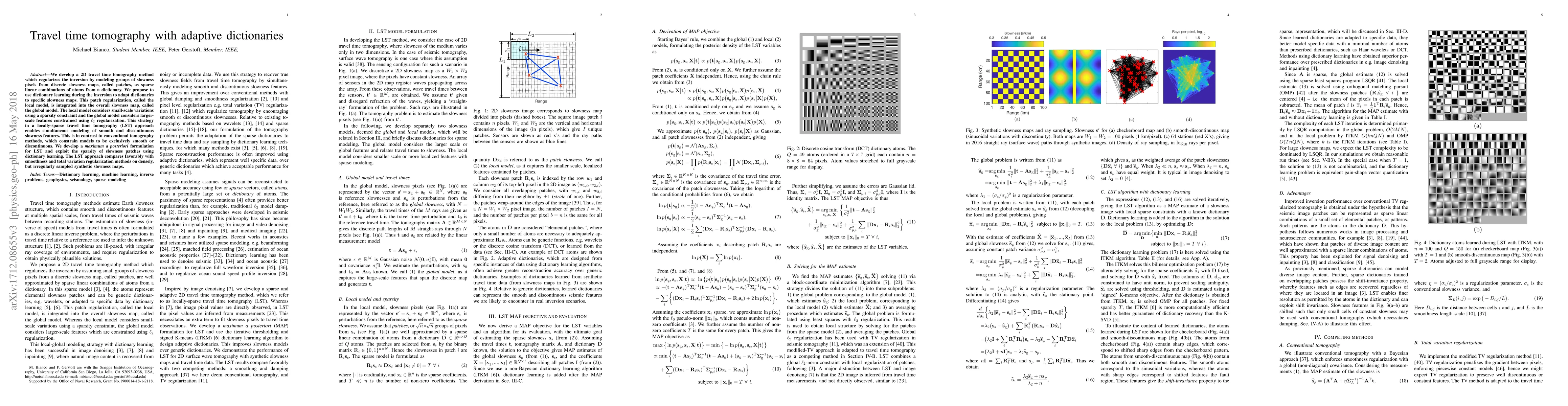 Researchers developed a 2D travel time tomography method that combines sparse linear combinations of atoms from a dictionary to model both smooth and discontinuous slowness features. The approach compares favorably with traditional methods in densely but irregularly sampled synthetic data.