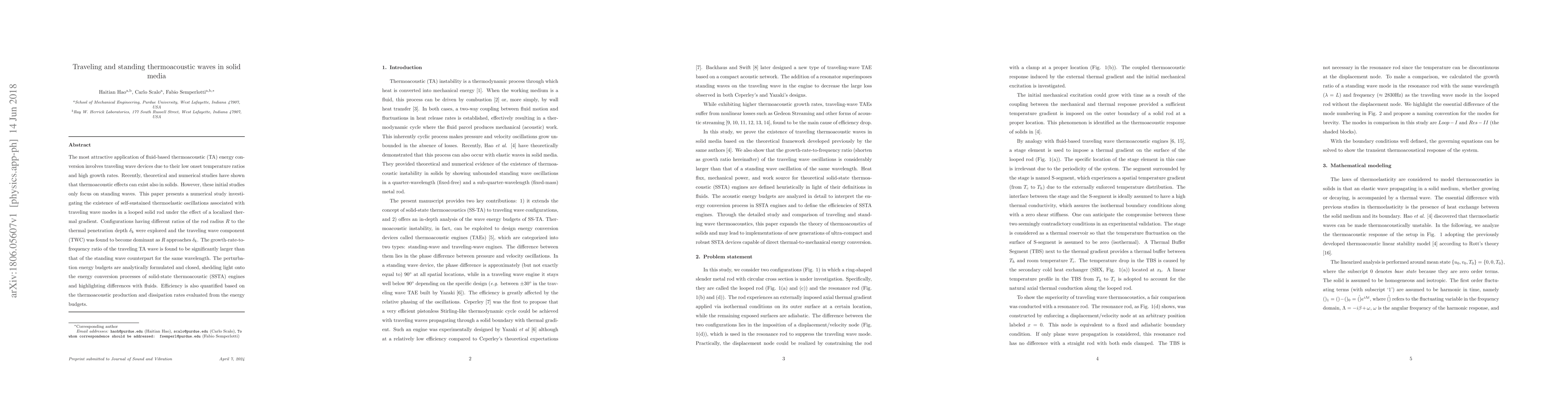 This paper investigates traveling wave thermoacoustic effects in solid media using numerical simulations, finding that traveling wave components dominate when the rod radius is comparable to the thermal penetration depth. The study reveals significantly higher growth-rate-to-frequency ratios for traveling waves compared to standing waves, and provides analytical energy budgets to quantify efficiency in solid-state thermoacoustic engines.