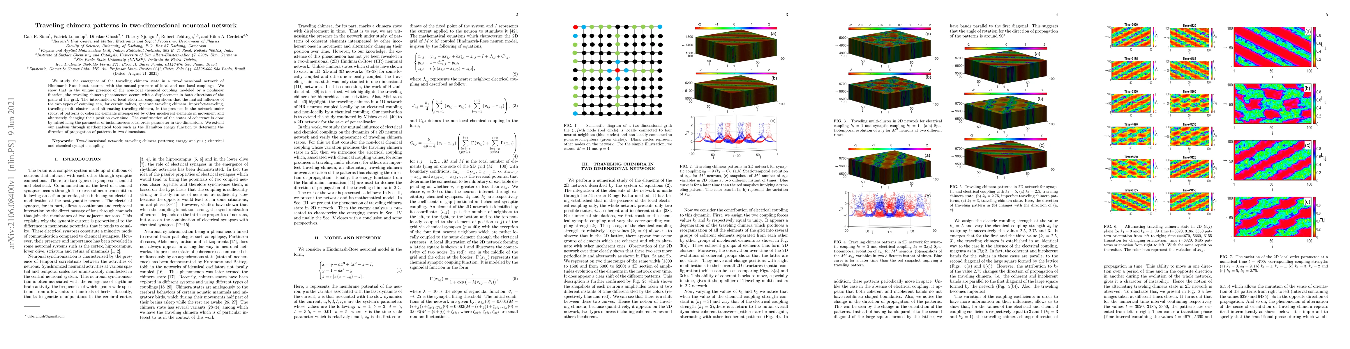Research reveals that a type of complex pattern called traveling chimera can emerge in two-dimensional neuronal networks with specific couplings, and this phenomenon can lead to various states of coherence with alternating or moving patterns of elements.