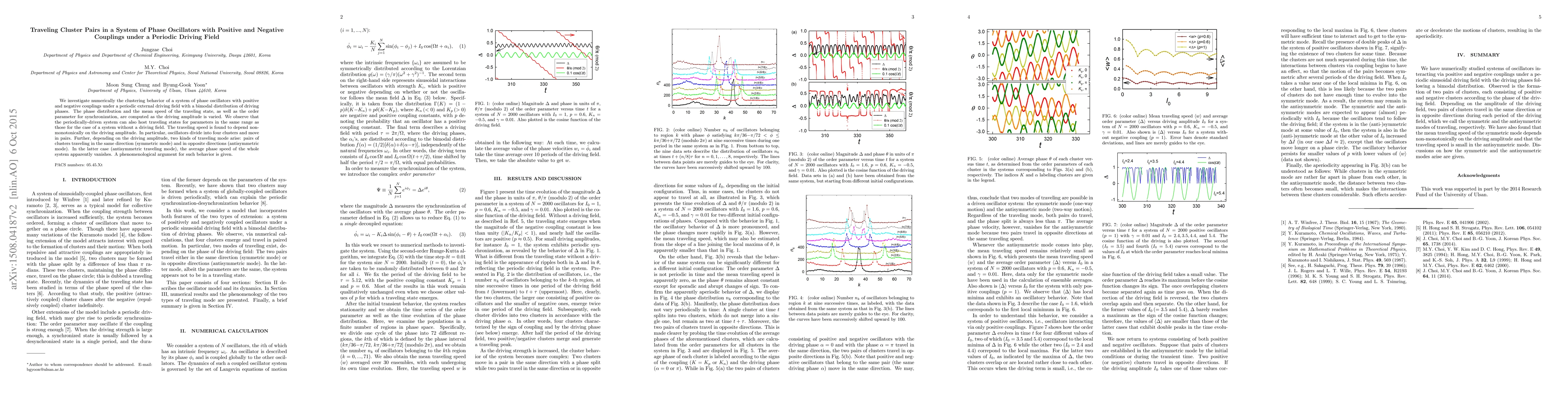 We investigate numerically the clustering behavior of a system of phase oscillators with positive and negative couplings under a periodic external driving field with a bimodal distribution of driving phases. The phase distribution and the mean speed of the traveling state, as well as the order parameter for synchronization, are computed as the driving amplitude is varied. We observe that the periodically-driven system can also host traveling states for parameters in the same range as those for the case of a system without a driving field. The traveling speed is found to depend non-monotonically on the driving amplitude. In particular, oscillators divide into four clusters and move in pairs. Further, depending on the driving amplitude, two kinds of traveling mode arise: pairs of clusters traveling in the same direction (symmetric mode) and in opposite directions (antisymmetric mode). In the latter case (antisymmetric traveling mode), the average phase speed of the whole system apparently vanishes. A phenomenological argument for such behavior is given.