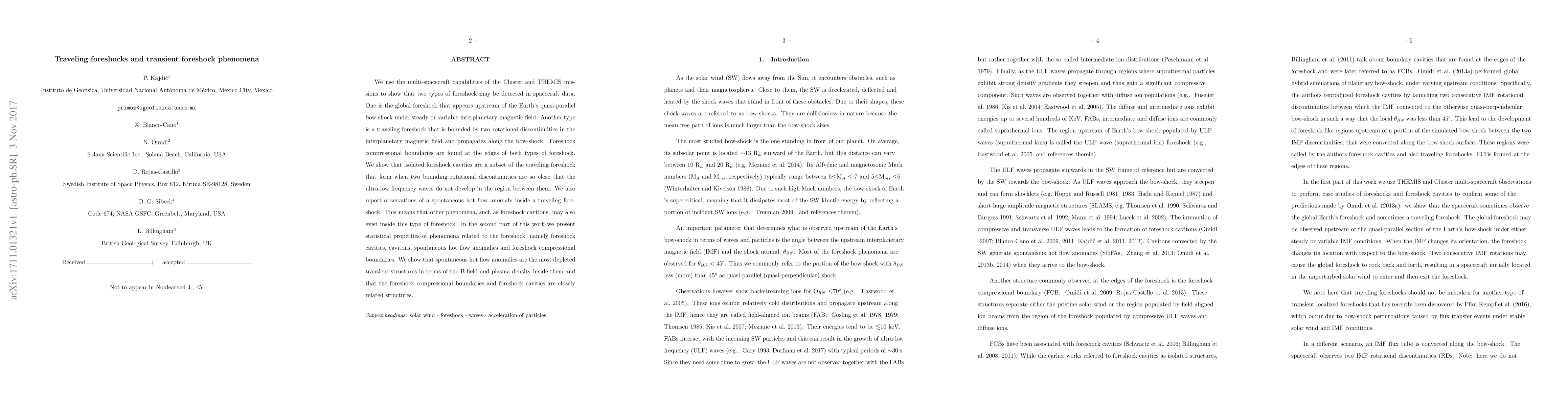 We use the multi-spacecraft capabilities of the Cluster and THEMIS missions to show that two types of foreshock may be detected in spacecraft data. One is the global foreshock that appears upstream of the Earth's quasi-parallel bow-shock under steady or variable interplanetary magnetic field. Another type is a traveling foreshock that is bounded by two rotational discontinuities in the interplanetary magnetic field and propagates along the bow-shock. Foreshock compressional boundaries are found at the edges of both types of foreshock. We show that isolated foreshock cavities are a subset of the traveling foreshock that form when two bounding rotational discontinuities are so close that the ultra-low frequency waves do not develop in the region between them. We also report observations of a spontaneous hot flow anomaly inside a traveling foreshock. This means that other phenomena, such as foreshock cavitons, may also exist inside this type of foreshock. In the second part of this work we present statistical properties of phenomena related to the foreshock, namely foreshock cavities, cavitons, spontaneous hot flow anomalies and foreshock compressional boundaries. We show that spontaneous hot flow anomalies are the most depleted transient structures in terms of the B-field and plasma density inside them and that the foreshock compressional boundaries and foreshock cavities are closely related structures.