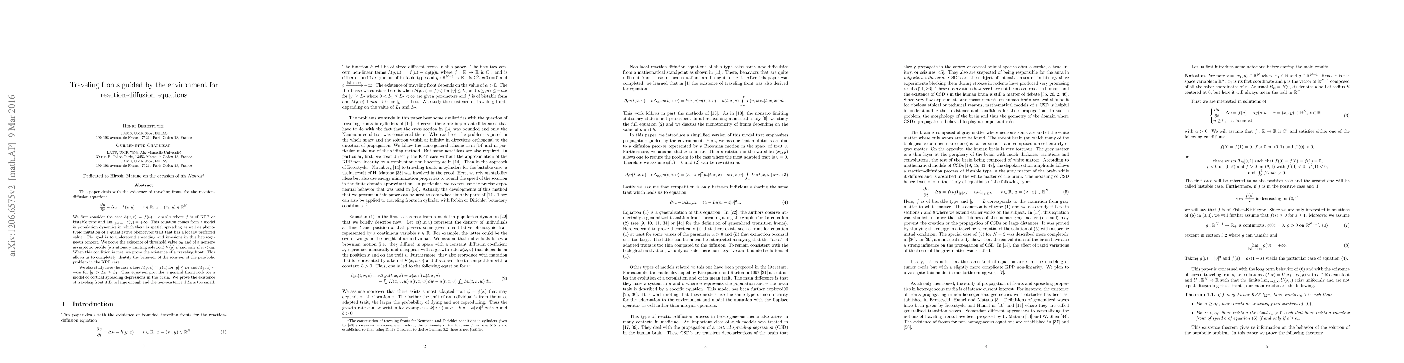 This paper deals with the existence of traveling fronts guided by the medium for a KPP reaction-diffusion equation coming from a model in population dynamics in which there is spatial spreading as well as genetic mutation of a quantitative genetic trait that has a locally preferred value. The goal is to understand spreading and invasions in this heterogeneous context. We prove the existence of a threshold value on the existence of a nonzero asymptotic profile (a stationary limiting solution). When a nonzero asymptotic profile exists, we prove the existence of a traveling front. This allows us to completely identify the behavior of the solution of the parabolic problem in the KPP case. We also study here the bistable case. The equation provides a general framework for a model of cortical spreading depressions in the brain. We prove the existence of traveling front if the area where theere is reaction is large enough and the non-existence if it is too small.