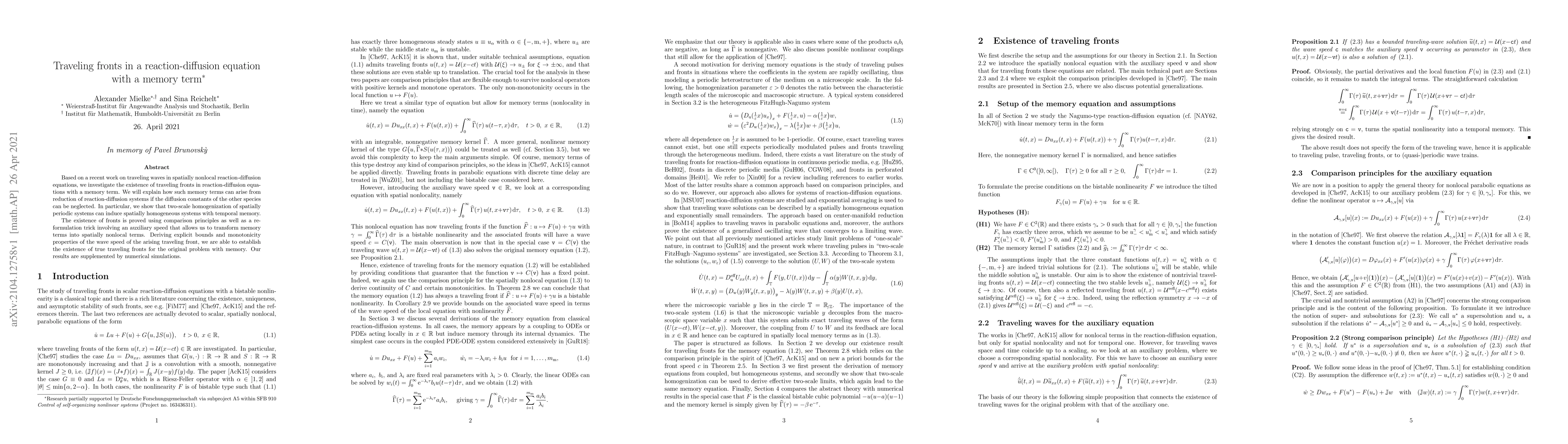 This paper investigates the existence of traveling fronts in reaction-diffusion equations incorporating memory terms, demonstrating their emergence through two-scale homogenization. The authors prove the existence of these fronts using comparison principles and reformulation techniques, providing explicit bounds and monotonicity properties for the wave speed, and support findings with numerical simulations.