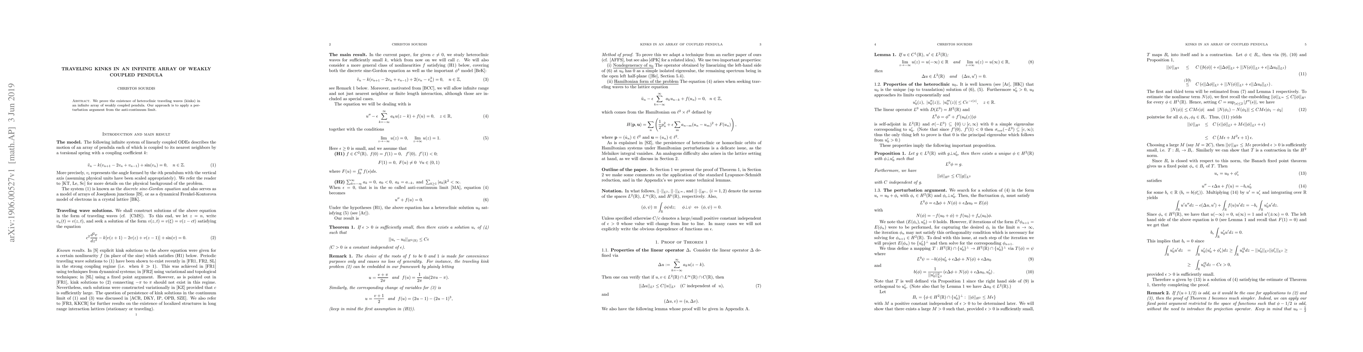 Summary: This paper demonstrates the existence of heteroclinic traveling kinks in an infinite array of weakly coupled pendula using a perturbation argument from the anti-continuum limit, providing new insights into the dynamics of such systems.