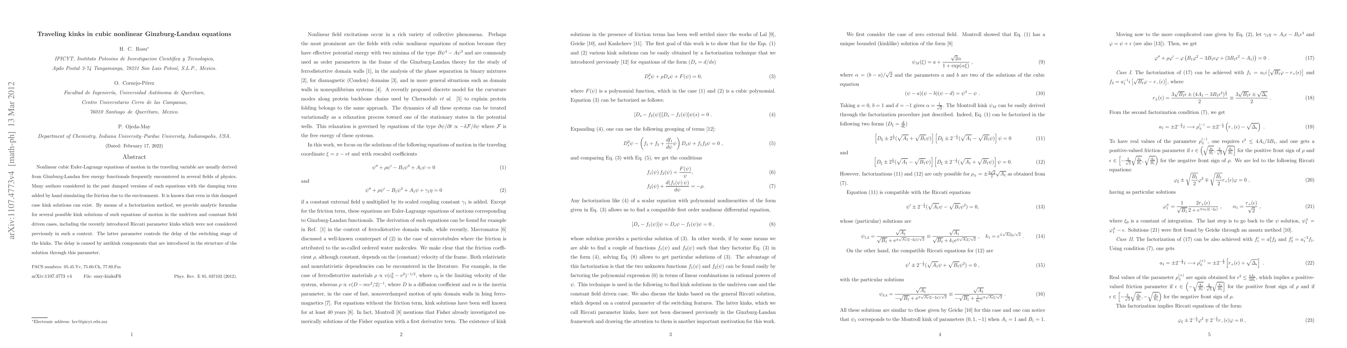 Nonlinear cubic Euler-Lagrange equations of motion in the traveling variable are usually derived from Ginzburg-Landau free energy functionals frequently encountered in several fields of physics. Many authors considered in the past damped versions of such equations with the damping term added by hand simulating the friction due to the environment. It is known that even in this damped case kink solutions can exist. By means of a factorization method, we provide analytic formulas for several possible kink solutions of such equations of motion in the undriven and constant field driven cases, including the recently introduced Riccati parameter kinks which were not considered previously in such a context. The latter parameter controls the delay of the switching stage of the kinks