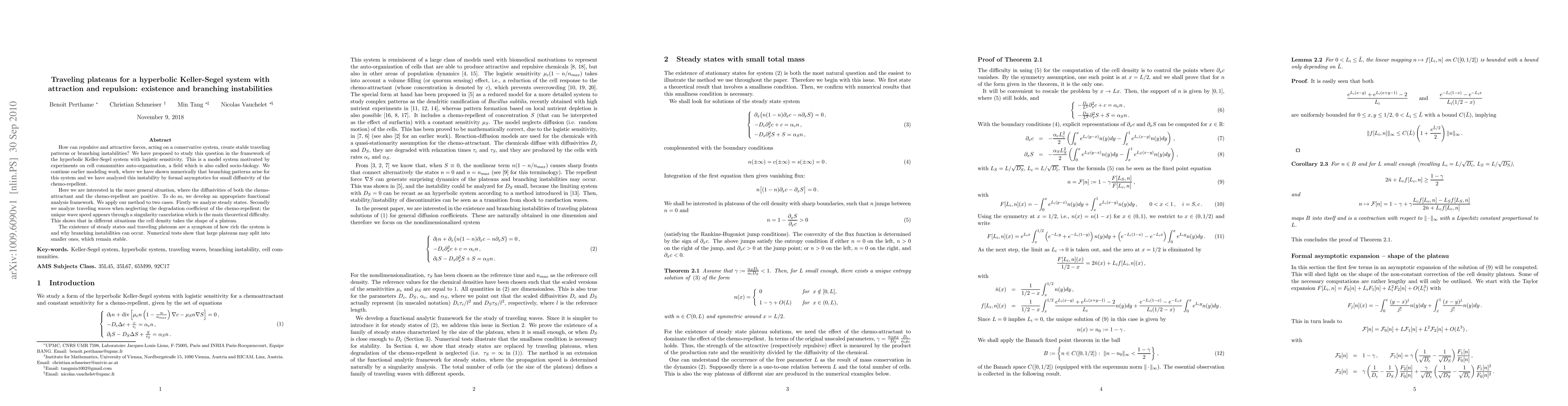 How can repulsive and attractive forces, acting on a conservative system, create stable traveling patterns or branching instabilities? We have proposed to study this question in the framework of the hyperbolic Keller-Segel system with logistic sensitivity. This is a model system motivated by experiments on cell communities auto-organization, a field which is also called socio-biology. We continue earlier modeling work, where we have shown numerically that branching patterns arise for this system and we have analyzed this instability by formal asymptotics for small diffusivity of the chemo-repellent. Here we are interested in the more general situation, where the diffusivities of both the chemo-attractant and the chemo-repellent are positive. To do so, we develop an appropriate functional analysis framework. We apply our method to two cases. Firstly we analyze steady states. Secondly we analyze traveling waves when neglecting the degradation coefficient of the chemo-repellent; the unique wave speed appears through a singularity cancelation which is the main theoretical difficulty. This shows that in different situations the cell density takes the shape of a plateau. The existence of steady states and traveling plateaus are a symptom of how rich the system is and why branching instabilities can occur. Numerical tests show that large plateaus may split into smaller ones, which remain stable.