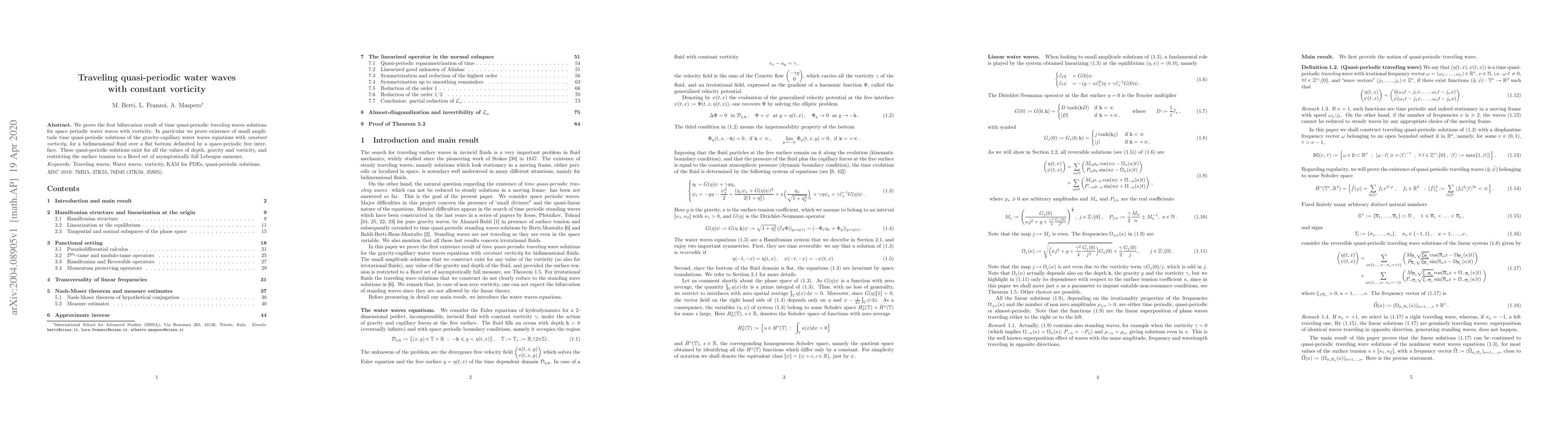 We prove the first bifurcation result of time quasi-periodic traveling waves solutions for space periodic water waves with vorticity. In particular we prove existence of small amplitude time quasi-periodic solutions of the gravity-capillary water waves equations with constant vorticity, for a bidimensional fluid over a flat bottom delimited by a space-periodic free interface. These quasi-periodic solutions exist for all the values of depth, gravity and vorticity, and restricting the surface tension to a Borel set of asymptotically full Lebesgue measure.