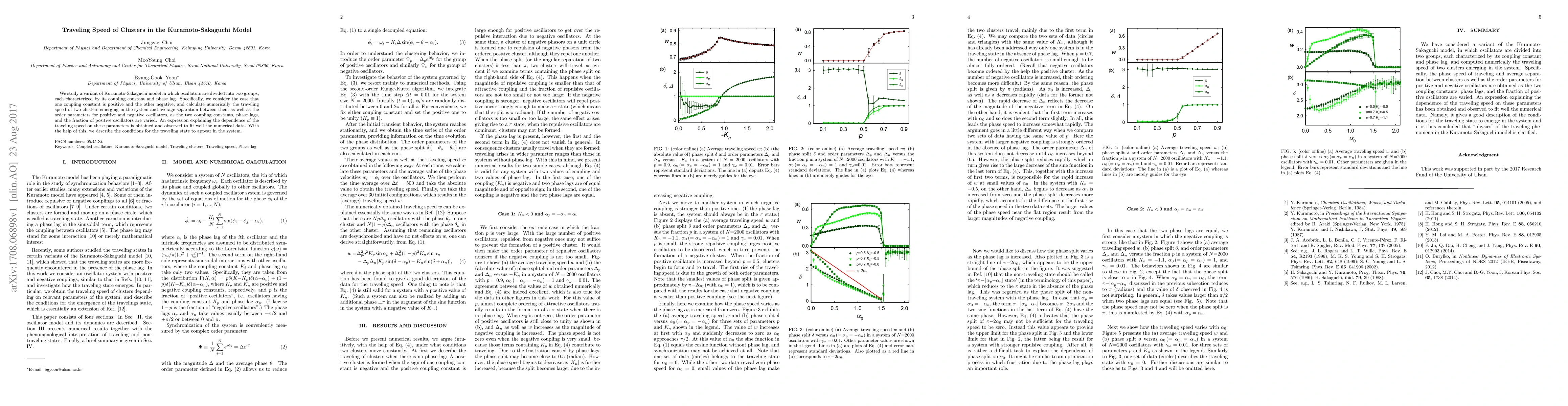 We study a variant of Kuramoto-Sakaguchi model in which oscillators are divided into two groups, each characterized by its coupling constant and phase lag. Specifically, we consider the case that one coupling constant is positive and the other negative, and calculate numerically the traveling speed of two clusters emerging in the system and average separation between them as well as the order parameters for positive and negative oscillators, as the two coupling constants, phase lags, and the fraction of positive oscillators are varied. An expression explaining the dependence of the traveling speed on these parameters is obtained and observed to fit well the numerical data. With the help of this, we describe the conditions for the traveling state to appear in the system.