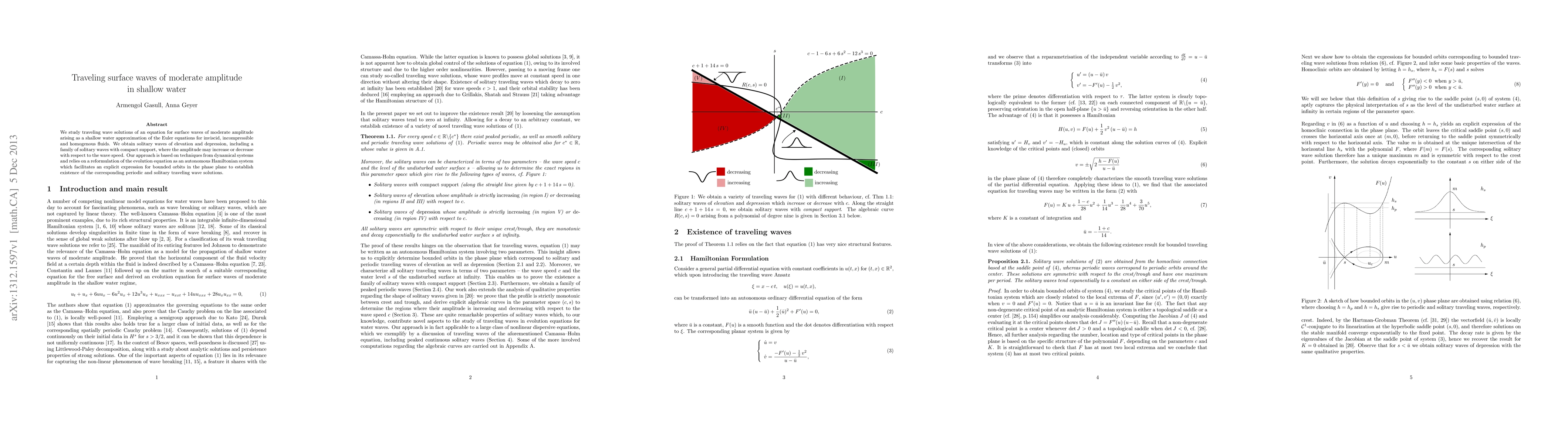 This paper investigates traveling wave solutions for moderate amplitude surface waves in shallow water, deriving solitary waves of elevation and depression. The study employs dynamical systems techniques and reformulates the governing equation as an autonomous Hamiltonian system to explicitly determine bounded orbits and establish the existence of periodic and solitary wave solutions.