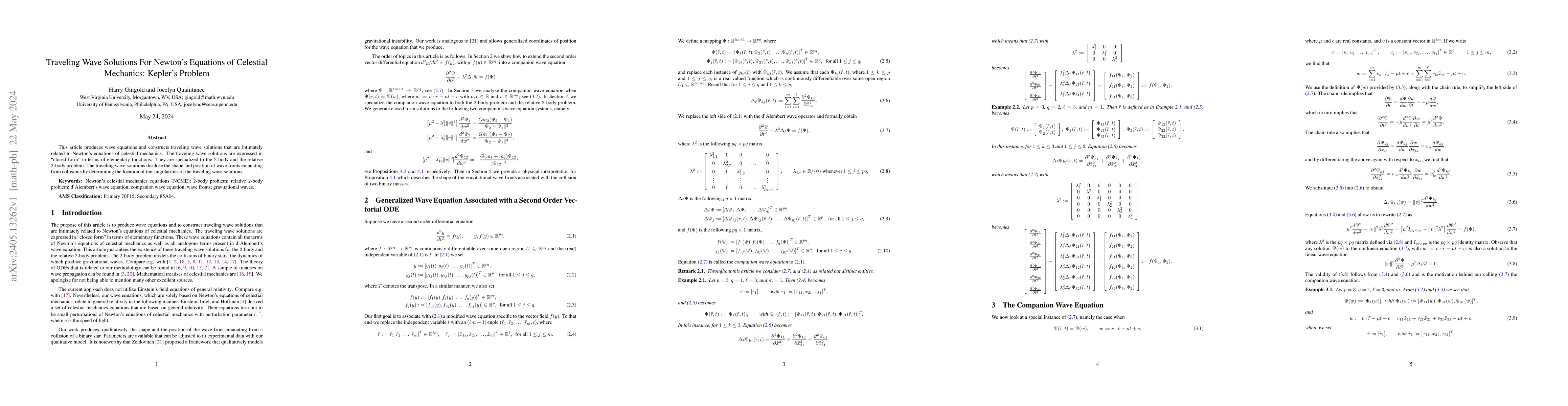 This paper develops wave equations and provides closed-form traveling wave solutions tied to Newton's celestial mechanics, specifically addressing the 2-body problem and detailing the wave fronts' shapes and collision locations via singularity analysis.