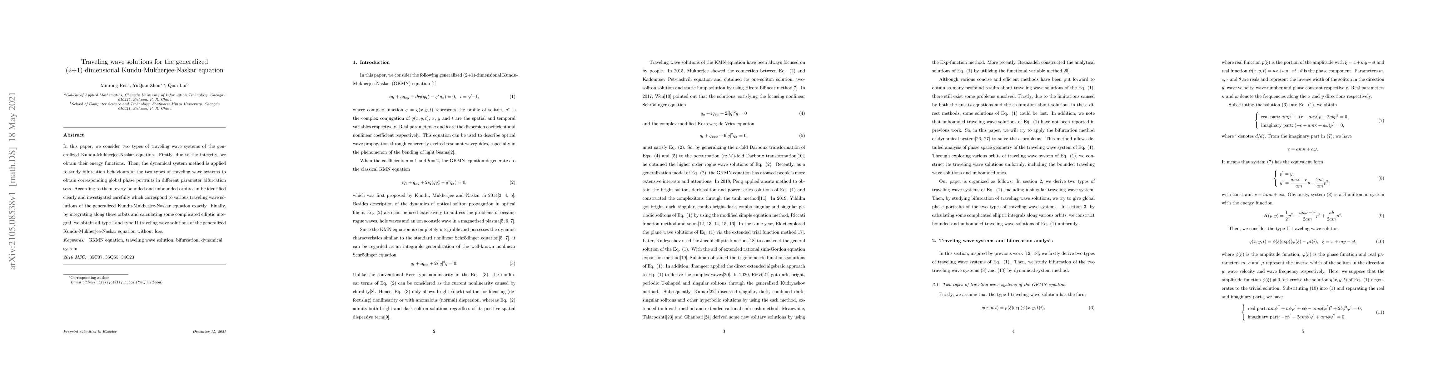 This paper investigates traveling wave solutions for the generalized (2+1)-dimensional Kundu-Mukherjee-Naskar equation by deriving energy functions and employing the dynamical system method to analyze bifurcation behaviors, ultimately obtaining type I and type II traveling wave solutions through elliptic integrals.
