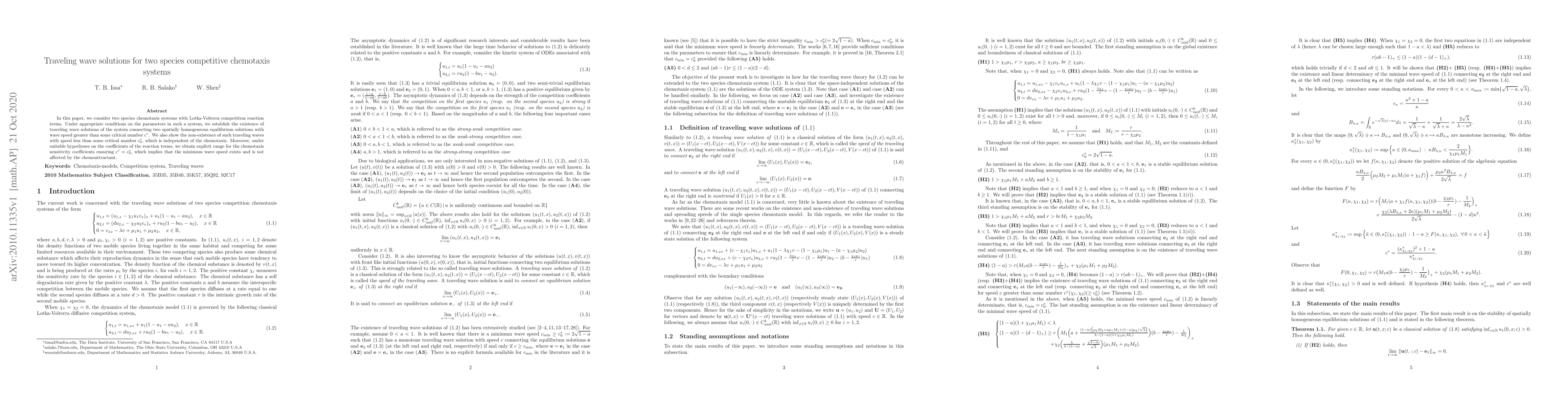 This paper establishes the existence of traveling wave solutions for two species competitive chemotaxis systems under specific parameter conditions, demonstrating that wave speeds greater than a critical threshold c* are possible, while speeds below a different threshold c*_0 are not. It also identifies conditions under which the chemotaxis sensitivity coefficients ensure the minimum wave speed is unaffected by chemoattractant variations.
