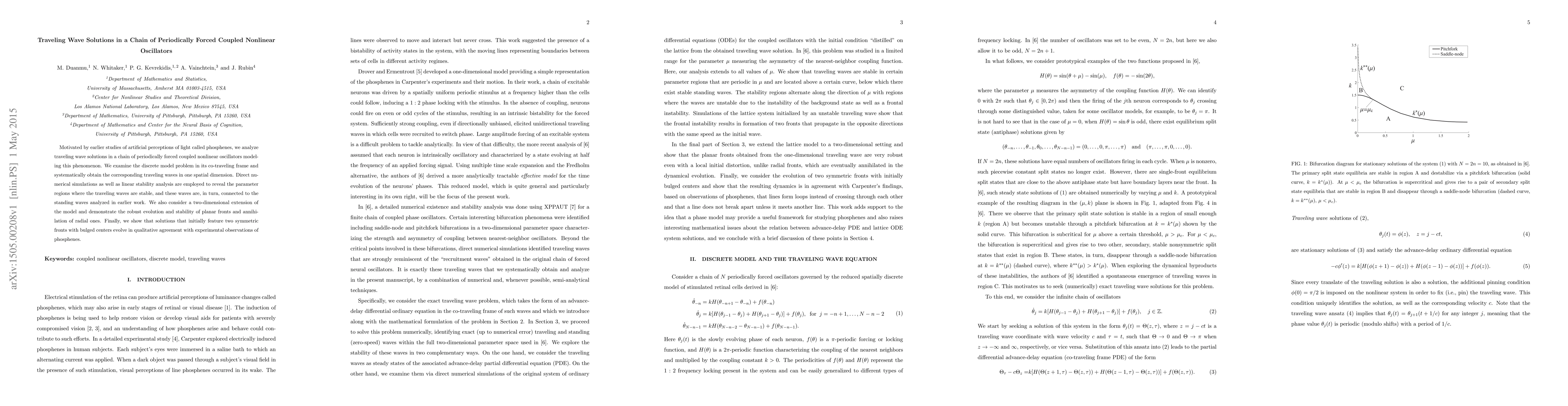 This paper investigates traveling wave solutions in a chain of periodically forced coupled nonlinear oscillators, inspired by phosphenes. It finds stable traveling waves through numerical simulations and stability analysis, and extends the model to two dimensions, showing the stability of planar fronts and annihilation of radial waves, aligning with experimental phosphene observations.