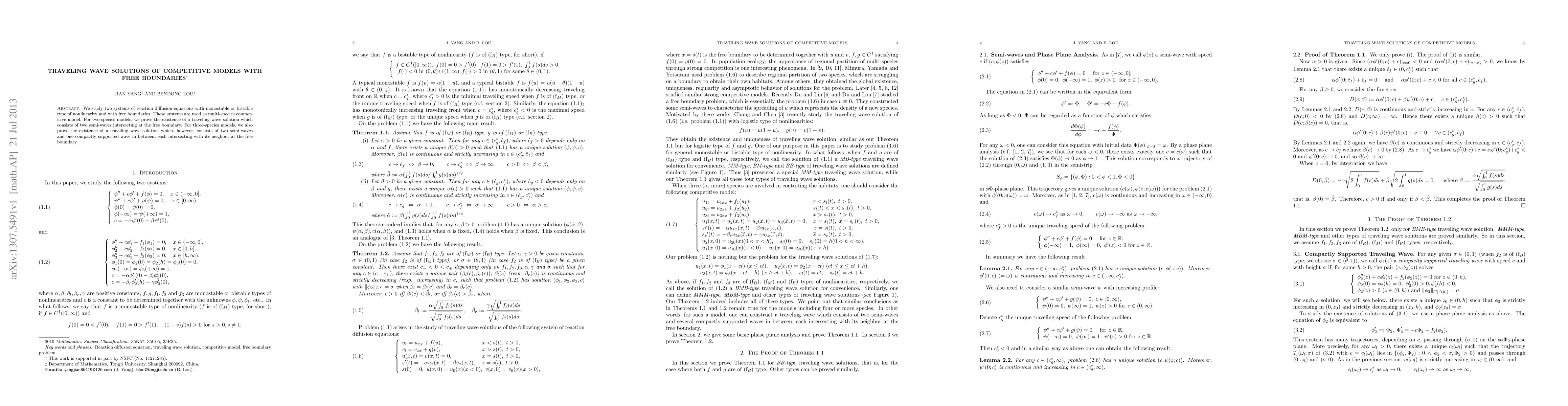 We study two systems of reaction diffusion equations with monostable or bistable type of nonlinearity and with free boundaries. These systems are used as multi-species competitive model. For two-species models, we prove the existence of a traveling wave solution which consists of two semi-waves intersecting at the free boundary. For three-species models, we also prove the existence of a traveling wave solution which, however, consists of two semi-waves and one compactly supported wave in between, each intersecting with its neighbor at the free boundary.