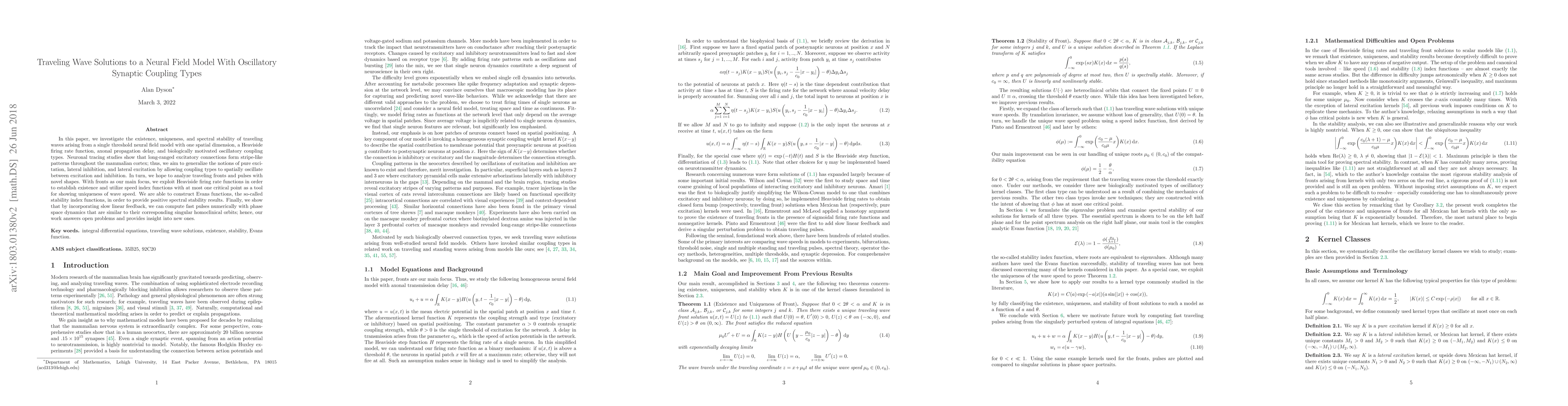 This paper explores traveling wave solutions in a neural field model featuring oscillatory synaptic coupling types, axonal delay, and a Heaviside firing rate function. The authors establish the existence, uniqueness, and spectral stability of these waves, revealing novel wave shapes and providing insights into the dynamics of neural networks.