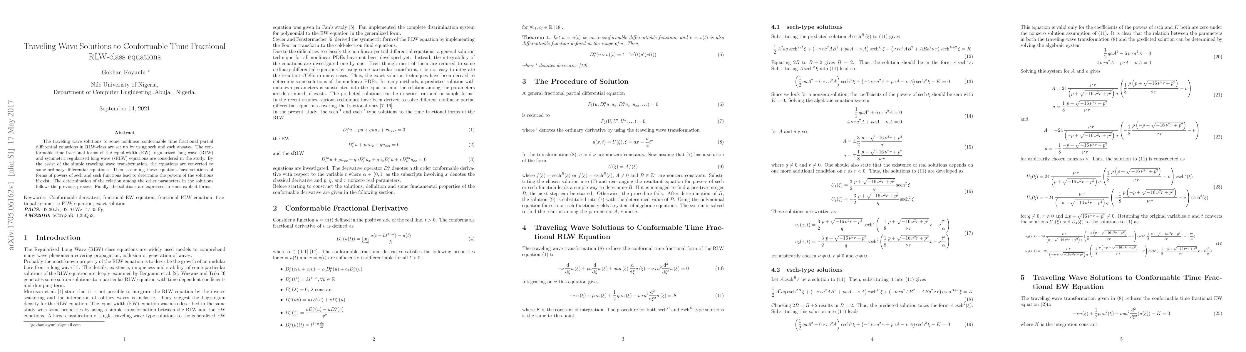 This paper develops traveling wave solutions for conformable time fractional RLW-class equations using sech and csch ansatz methods. It transforms the fractional partial differential equations into ordinary differential equations via a simple traveling wave transformation, then determines the explicit forms of the solutions.