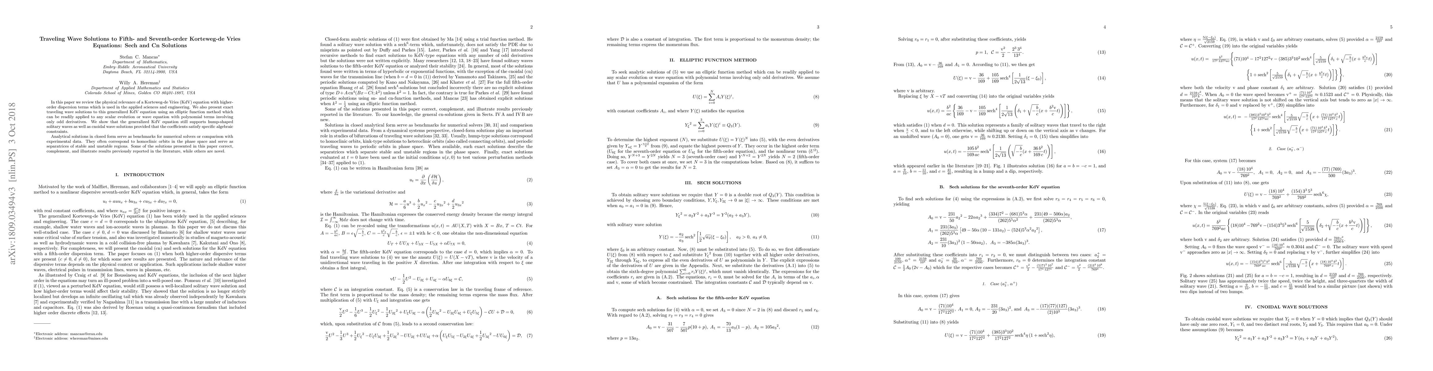 In this paper we review the physical relevance of a Korteweg-de Vries (KdV) equation with higher-order dispersion terms which is used in the applied sciences and engineering. We also present exact traveling wave solutions to this generalized KdV equation using an elliptic function method which can be readily applied to any scalar evolution or wave equation with polynomial terms involving only odd derivatives. We show that the generalized KdV equation still supports hump-shaped solitary waves as well as cnoidal wave solutions provided that the coefficients satisfy specific algebraic constraints. Analytical solutions in closed form serve as benchmarks for numerical solvers or comparison with experimental data. They often correspond to homoclinic orbits in the phase space and serve as separatrices of stable and unstable regions. Some of the solutions presented in this paper correct, complement, and illustrate results previously reported in the literature, while others are novel.