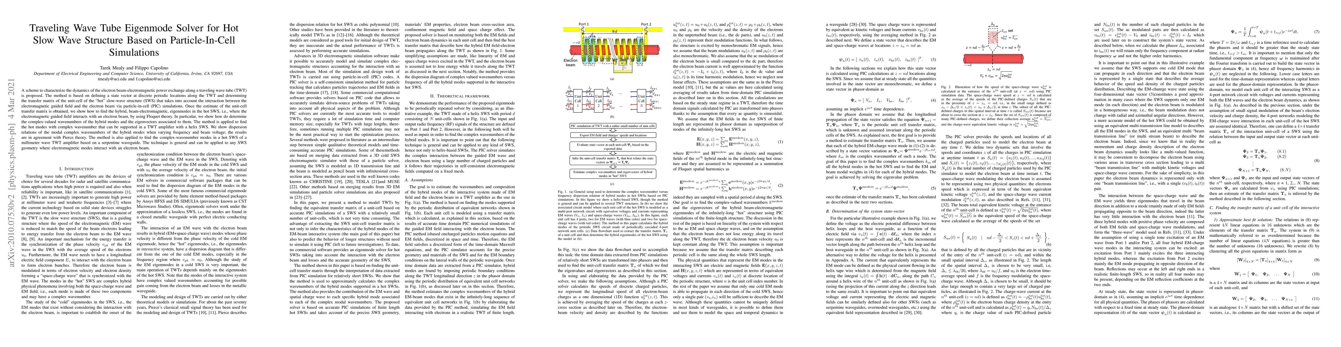 A scheme to characterize the dynamics of the electron beam-electromagnetic power exchange along a traveling wave tube (TWT) is proposed. The method is based on defining a state vector at discrete periodic locations along the TWT and determining the transfer matrix of the unit-cell of the "hot" slow-wave structure (SWS) that takes into account the interaction between the electromagnetic guided field and the electron beam via particle-in-cell (PIC) simulations. Once the estimate of the unit-cell transfer matrix is obtained, we show how to find the hybrid, beam-electromagnetic, eigenmodes in the hot SWS, i.e., where the electromagnetic guided field interacts with an electron beam, by using Floquet theory. In particular, we show how do determine the complex-valued wavenumbers of the hybrid modes and the eigenvectors associated to them. The method is applied to find the hot modes with complex wavenumber that can be supported in a TWT amplifier with a helix SWS. We show dispersion relations of the modal complex wavenumbers of the hybrid modes when varying frequency and beam voltage; the results are in agreement with Pierce theory. The method is also applied to find the complex-wavenumber modes in a hot SWS of a millimeter wave TWT amplifier based on a serpentine waveguide. The technique is general and can be applied to any SWS geometry where electromagnetic modes interact with an electron beam.