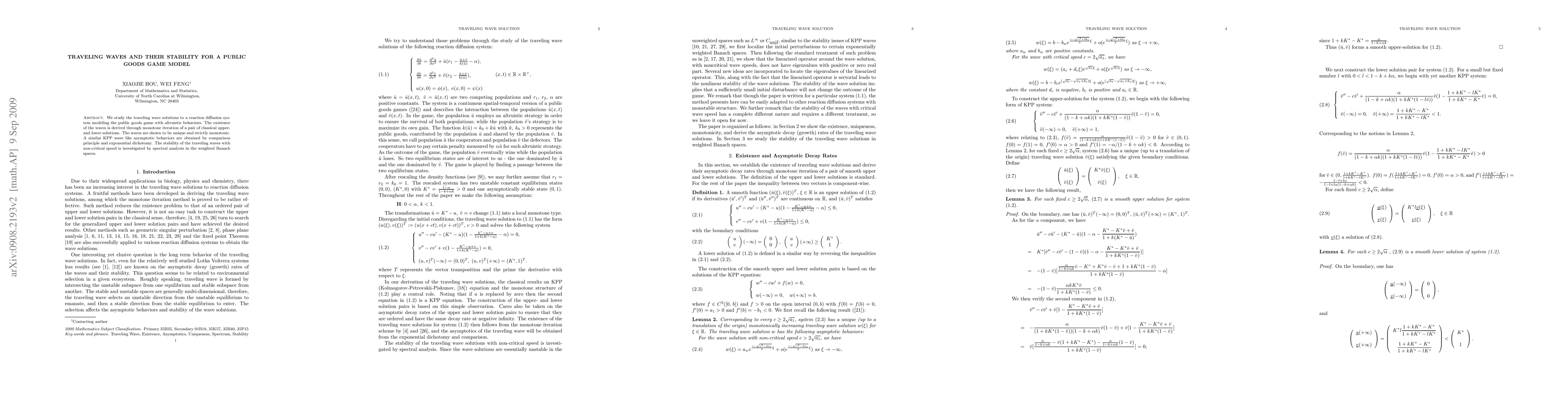 This paper explores the traveling wave solutions for a reaction-diffusion system modeling the public goods game, proving their uniqueness and monotonicity. Stability of these waves is analyzed using spectral methods in weighted Banach spaces, confirming their robustness for non-critical speeds.
