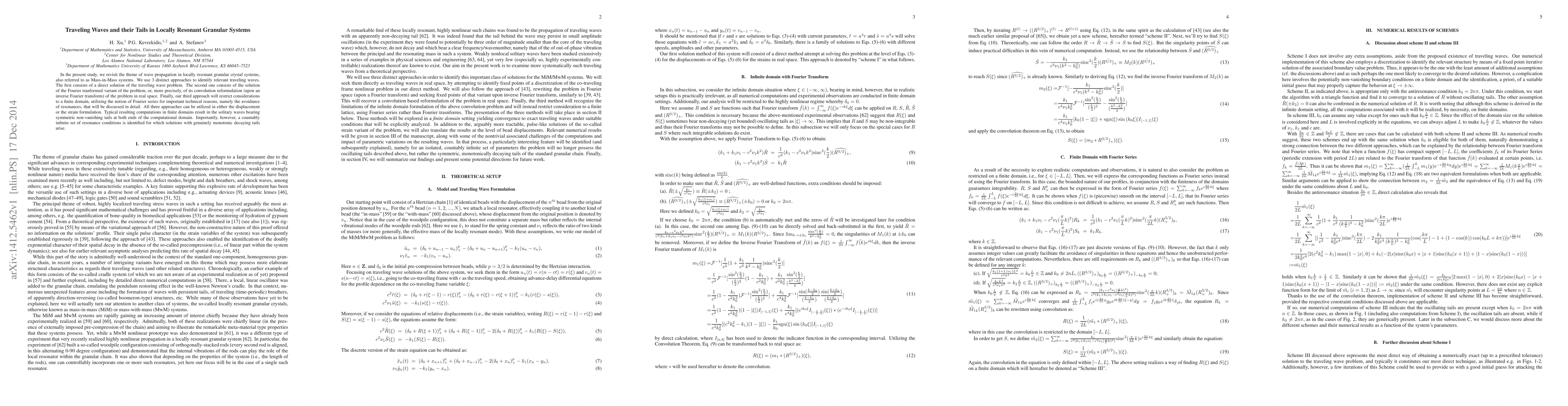 This paper investigates wave propagation in locally resonant granular crystal systems using three distinct analytical approaches to identify traveling waves. The study reveals solitary waves with symmetric tails and identifies a set of resonance conditions yielding monotonic decaying tails.